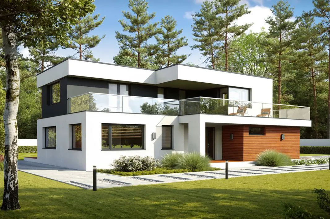 Проект двухэтажного современного дома в стиле Райт с гаражом и террасой.