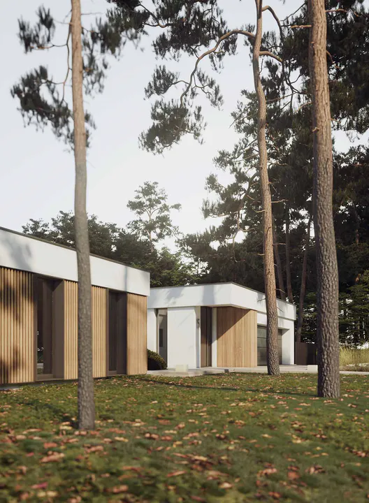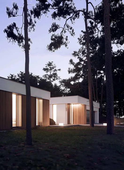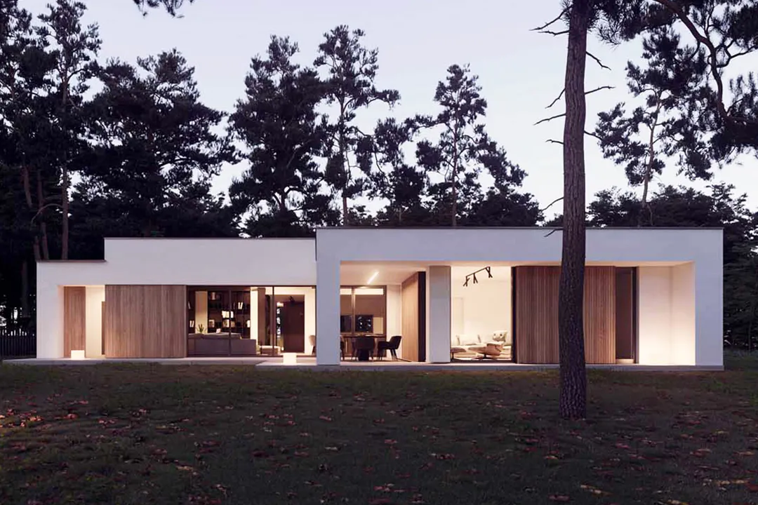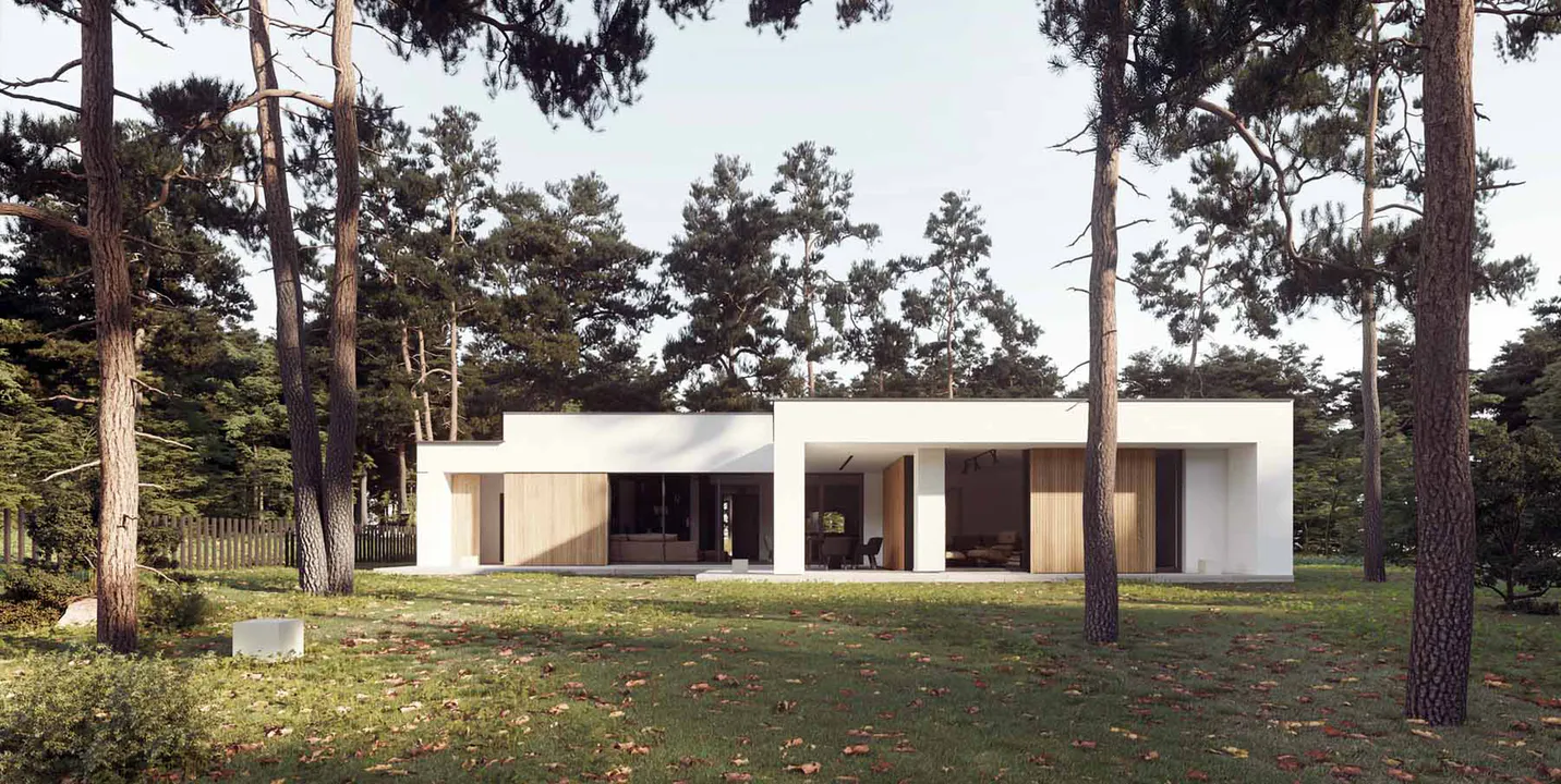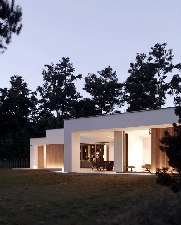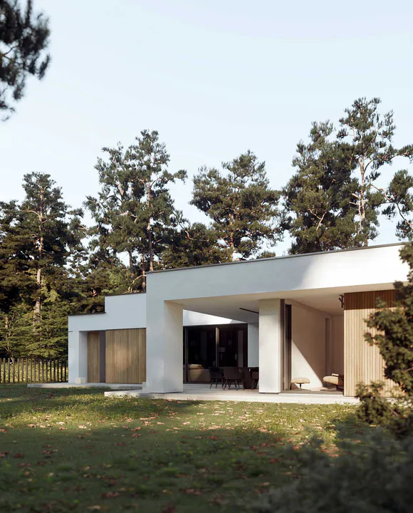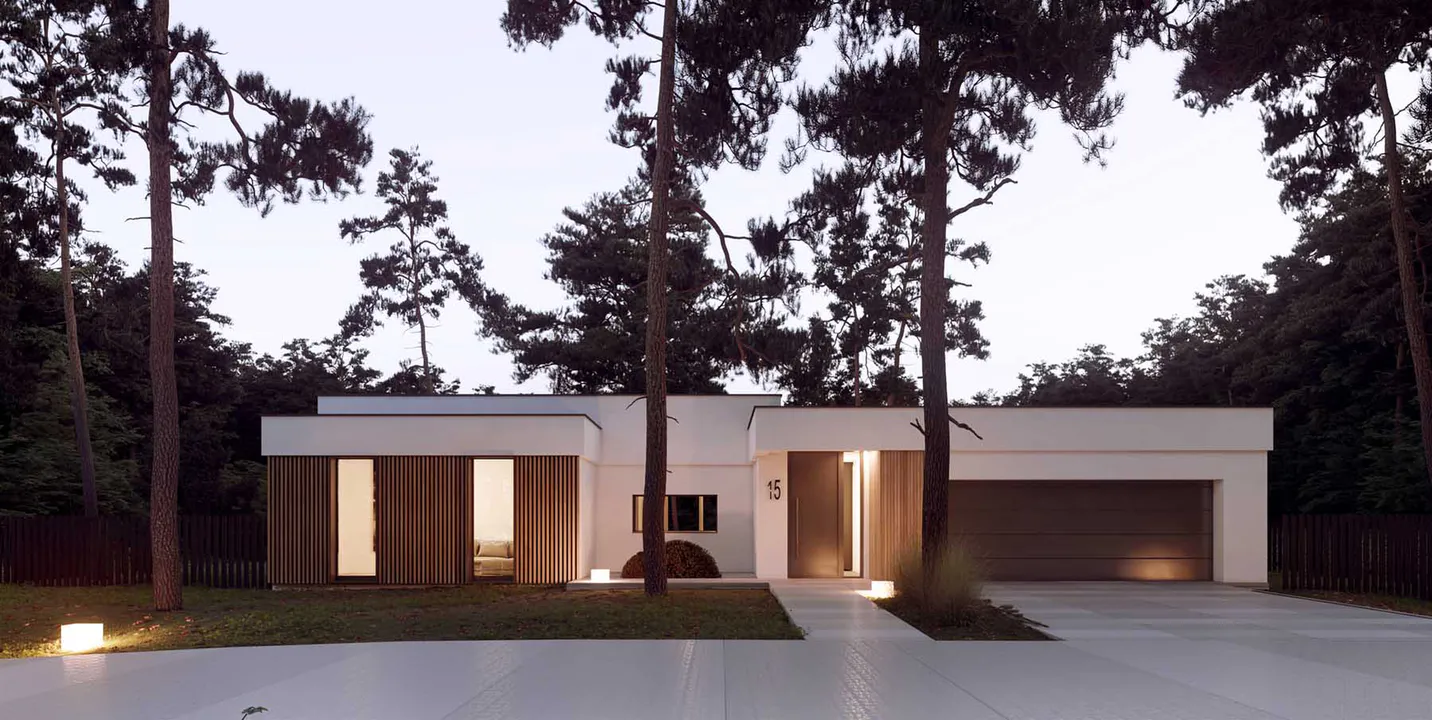 Фасад дома выполнен в минималистичном стиле Хайтек, сочетая белые оштукатуренные поверхности с теплыми деревянными элементами, что создает контраст и придает зданию выразительность.