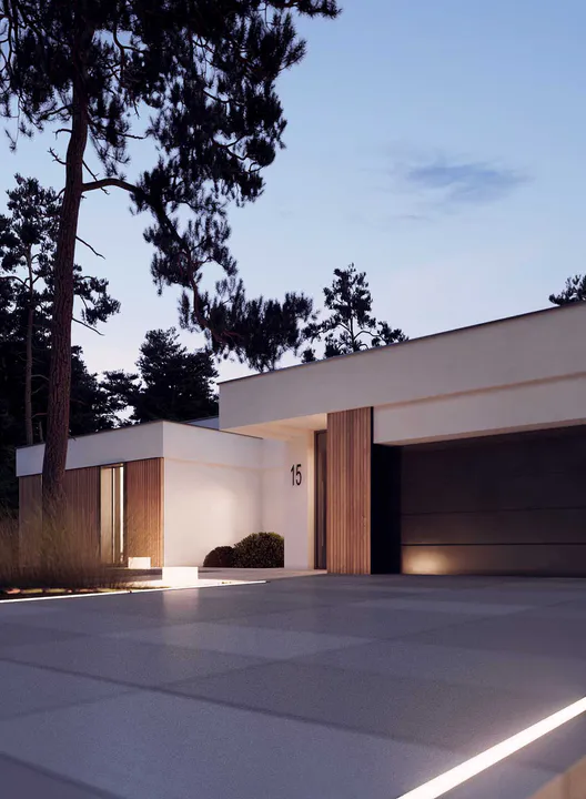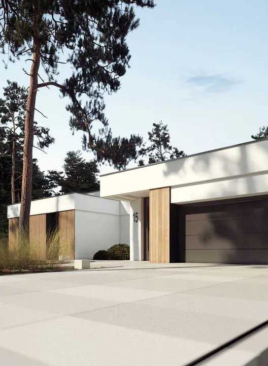 Справа от входа находится интегрированный гараж с широкими, горизонтальными секционными воротами серого цвета, гармонирующими с общей цветовой палитрой дома.