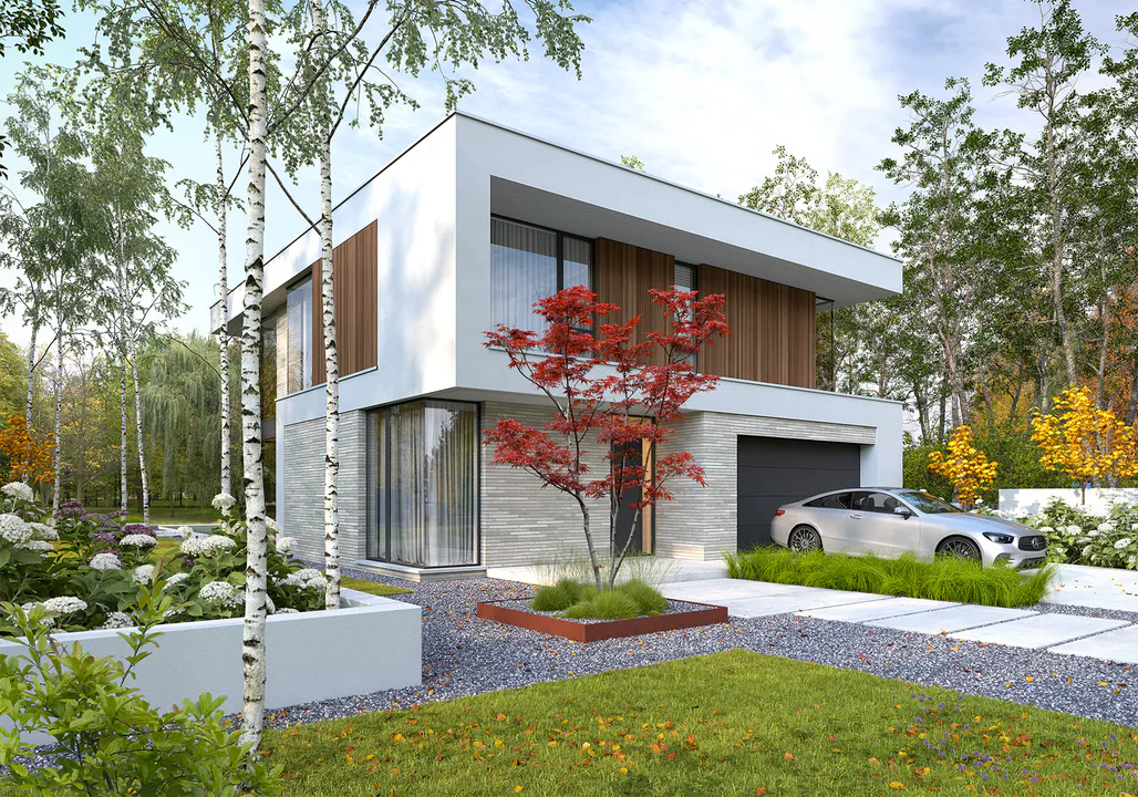 Фасад выполнен из современных материалов, таких как стекло, дерево и светлая штукатурка, придавая зданию гармоничный и стильный вид. Внутри дома открытая планировка и много светлого пространства.