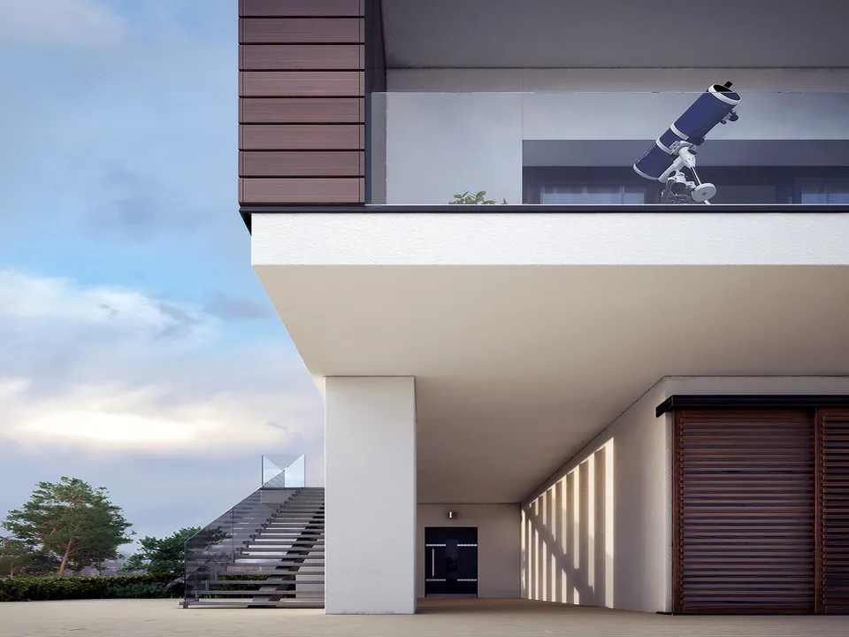 Проект двухэтажного дома в стиле Хайтек с плоской крышей, террасой и гаражом.