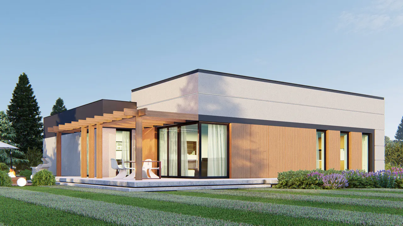 Проект одноэтажного дома в стиле Хайтек с плоской крышей.