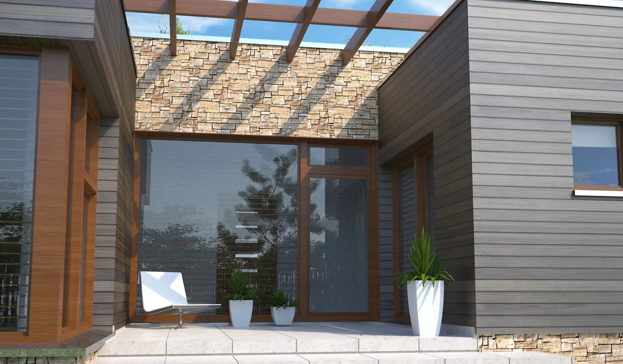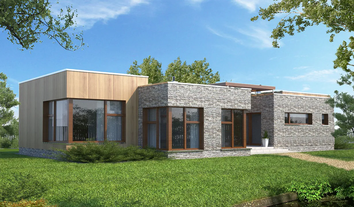 Использование натуральных материалов, таких как камень и дерево, в интерьере дома, наряду с панорамным остеклением, подчеркивает связь с природой, что является современным решением.