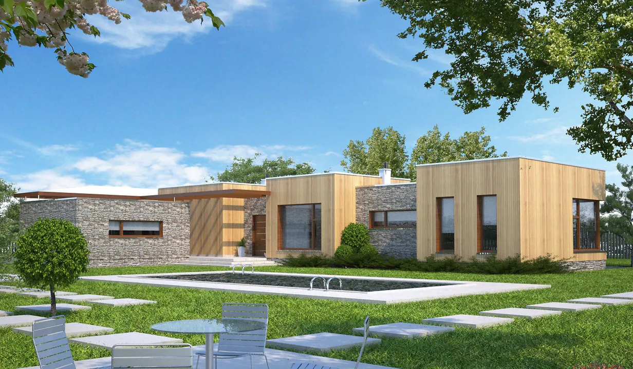 Плоская кровля и четкие линии подчеркивают современный архитектурный стиль Хайтек.