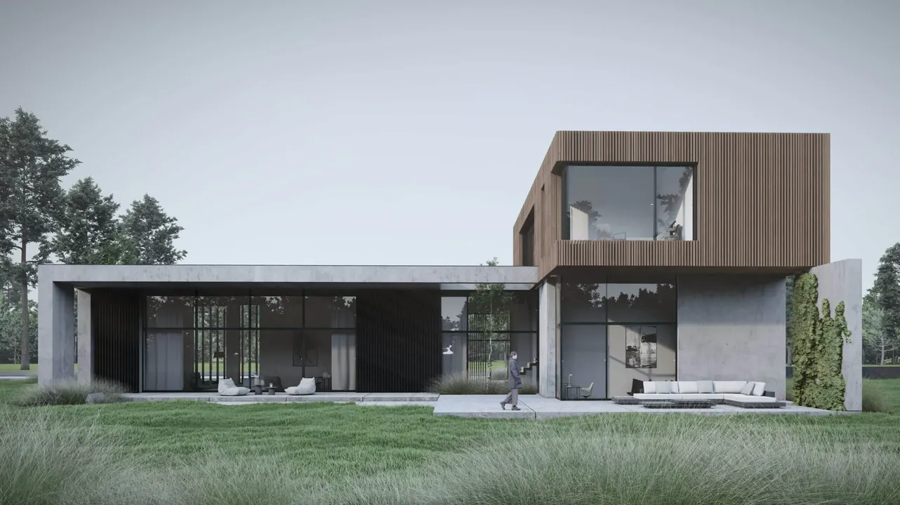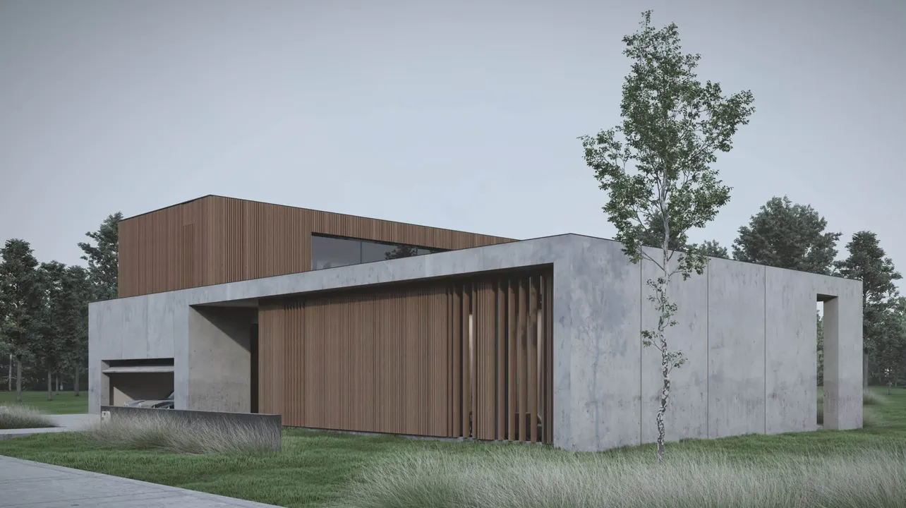 Фасадное решение строится на контрасте фактур: грубого необработанного бетона и натурального дерева. Вертикальные деревянные рейки улучшают теплотехнические характеристики стен и формируют ритмичный рисунок фасада.