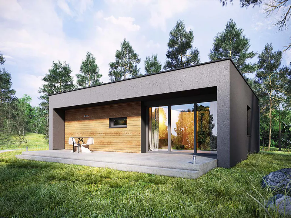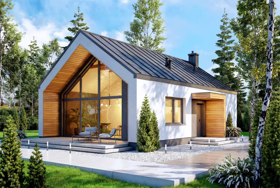 Дизайн фасада построен на контрасте антрацитовой штукатурки и натуральных деревянных панелей. Со стороны террасы предусмотрено панорамное остекление, объединяющее внутреннее пространство с окружающим ландшафтом.
