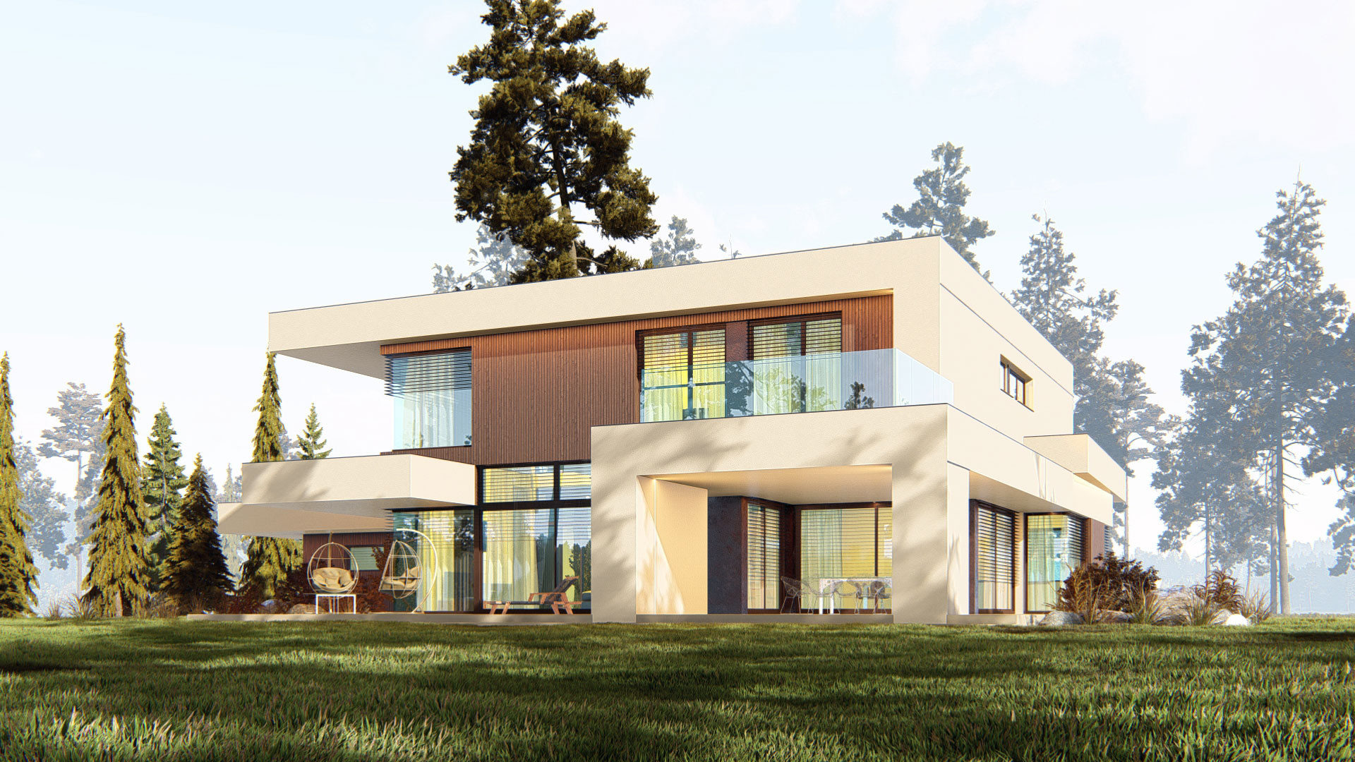 Строгость линий и плоская кровля уравновешиваются отделкой из натурального дерева и мягким акцентом светлой штукатурки, что придает дому современный, но в то же время уютный облик.