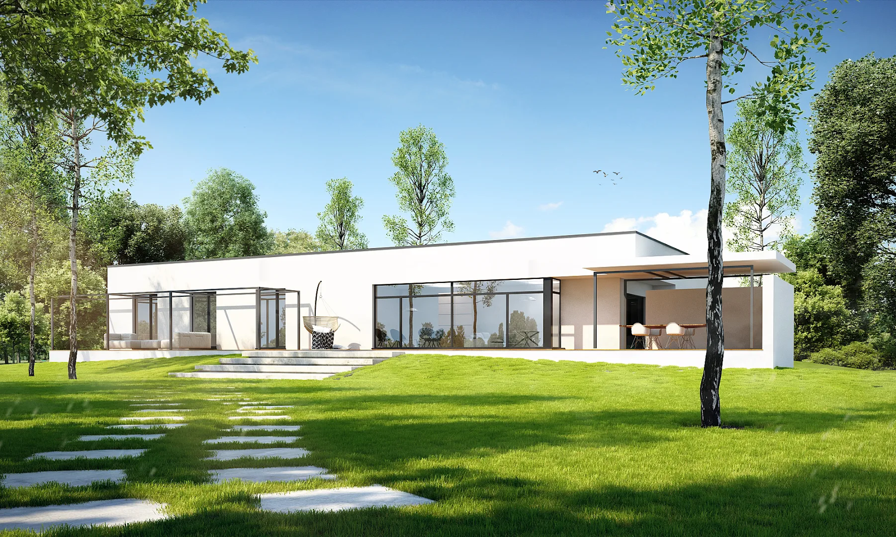 Белоснежный фасад и плоская крыша подчеркивают минимализм архитектуры и масштаб остекления. Здание сформировано из нескольких геометрических блоков, создающих сложную, но гармоничную форму. Отсутствие лишнего декора акцентирует чистоту линий, а темные оконные рамы эффектно контрастируют с белым фоном стен.