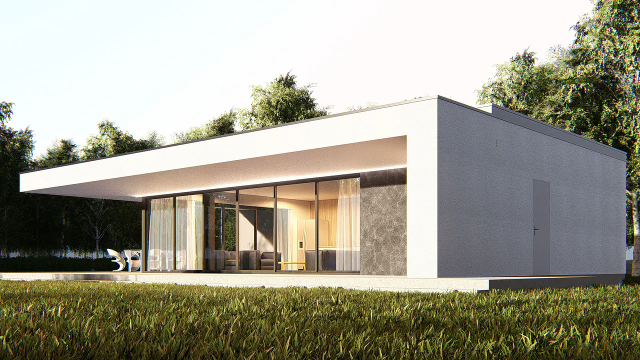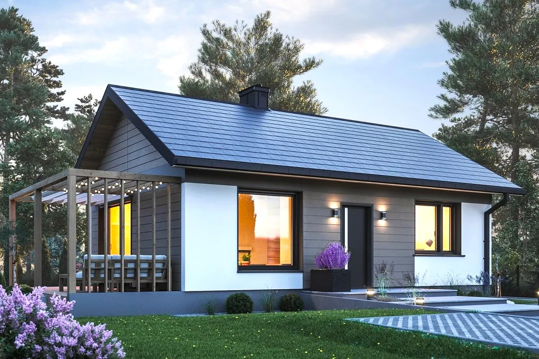 Проект небольшого одноэтажного дома с плоской крышей и террасой.