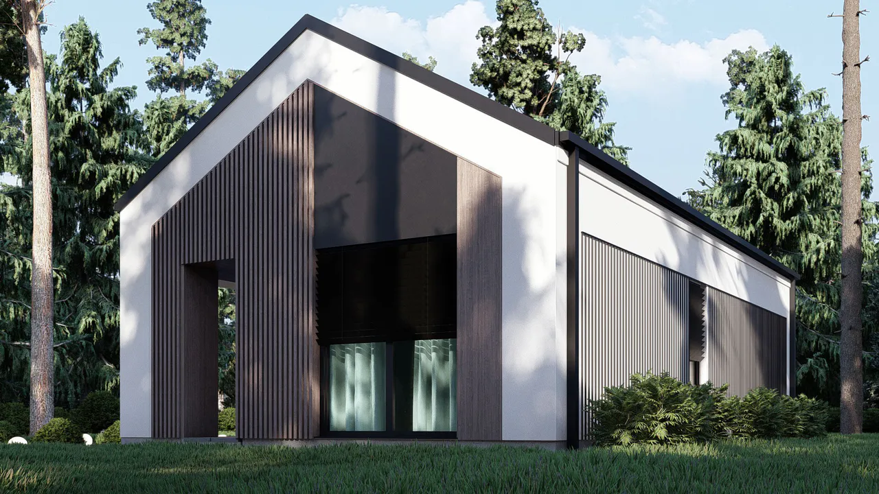 Проект представляет собой стильный одноэтажный барнхаус, который отлично подходит для загородного отдыха или постоянного проживания небольшой семьи.