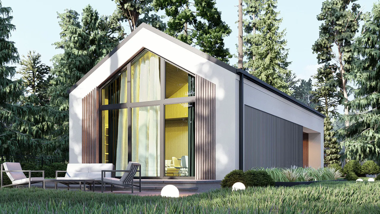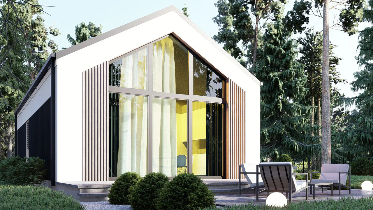 Двускатная крыша без свесов подчеркивает строгость линий здания. Фасад дополнен масштабным панорамным остеклением во всю высоту, которое обеспечивает обилие естественного света в интерьере. Внешние стены выполнены в светлых тонах с использованием вертикальных деревянных реек и контрастных графитовых вставок.