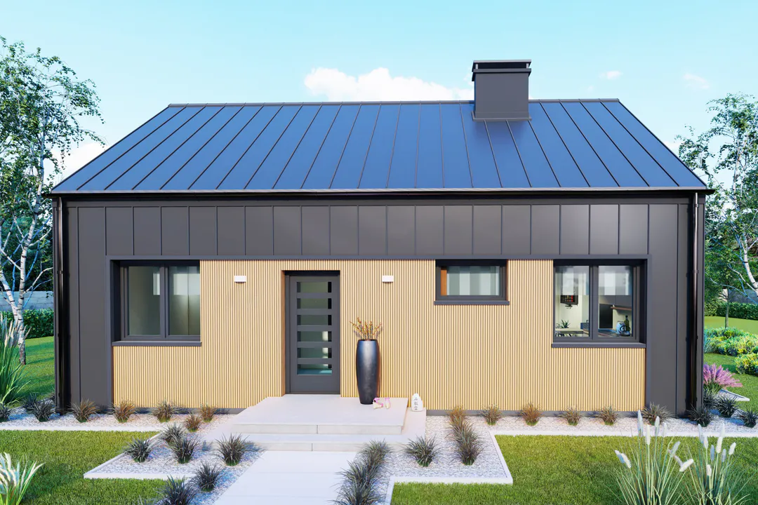 Проект небольшого дома с мансардным этажом и террасой. Дом имеет темно-серый деревянный фасад и двухскатную крышу с кровлей из фальцованных металлических листов.