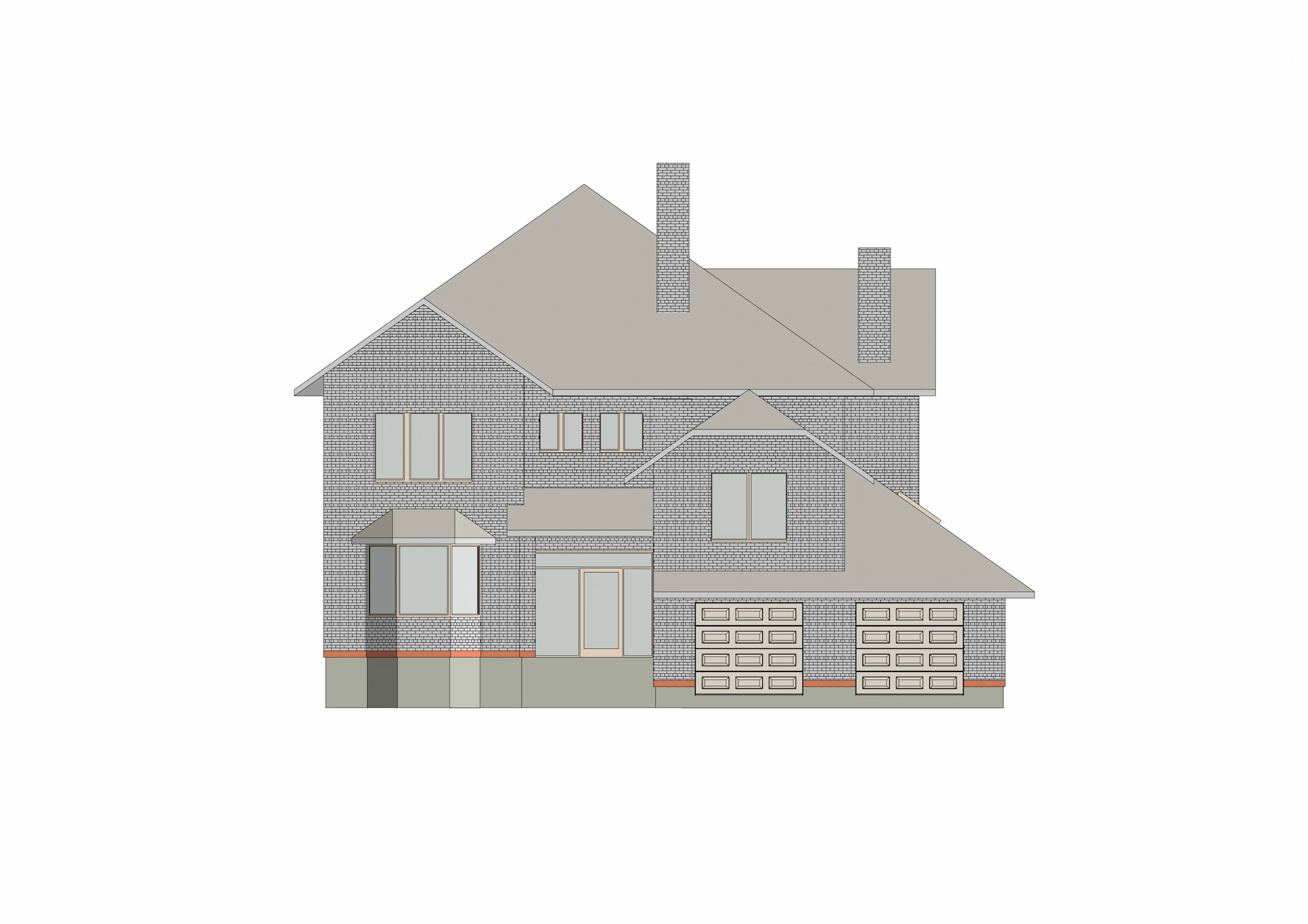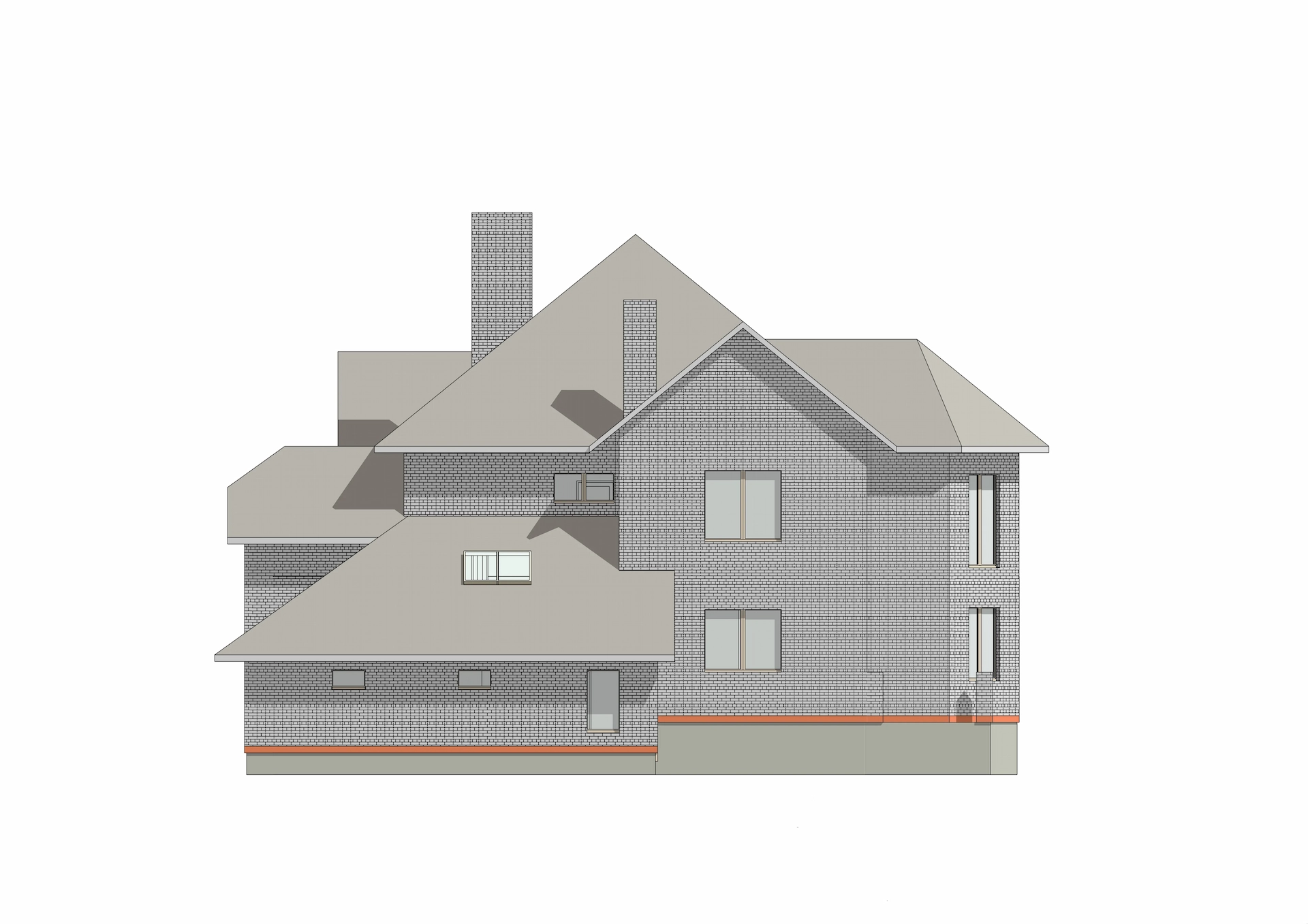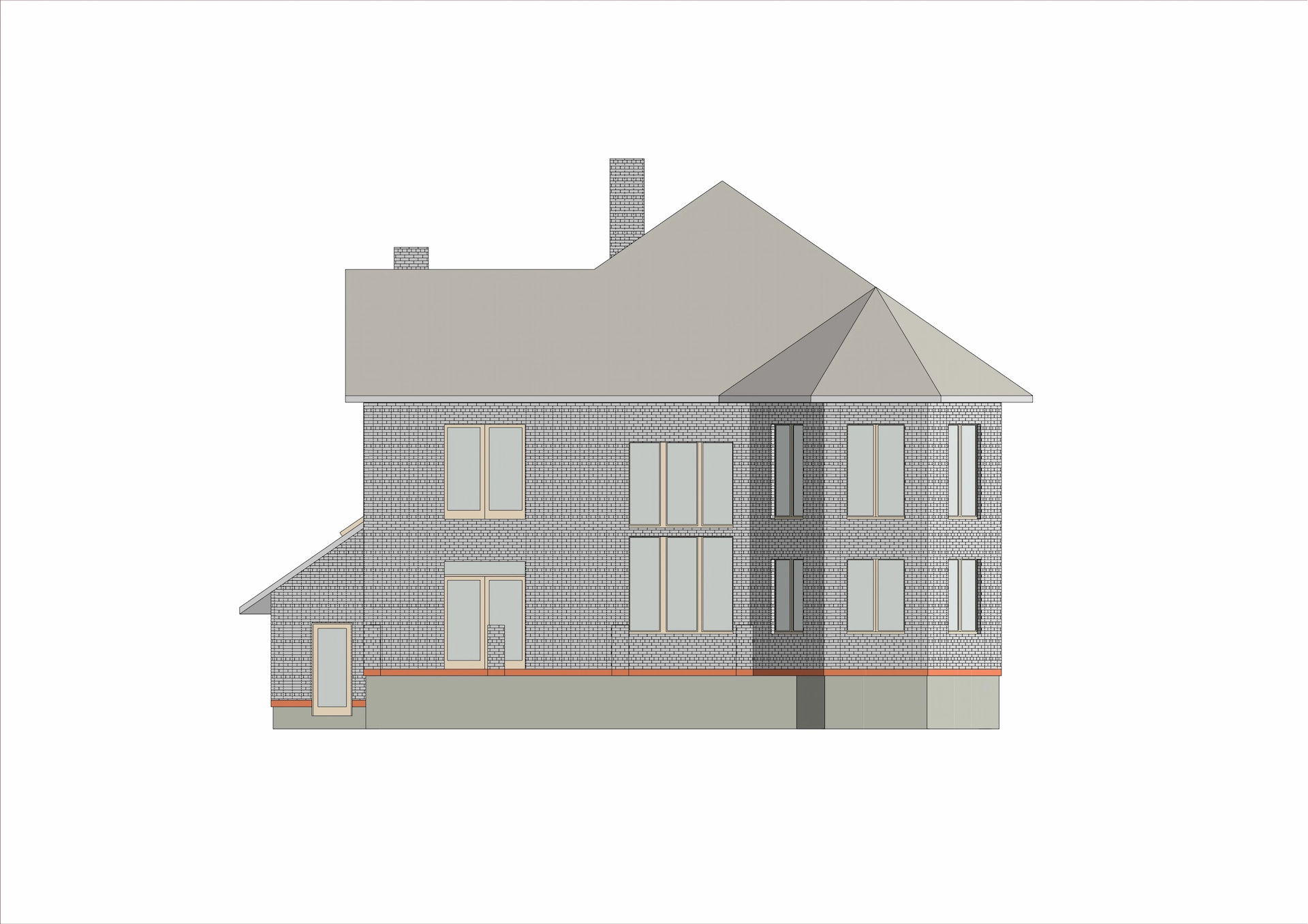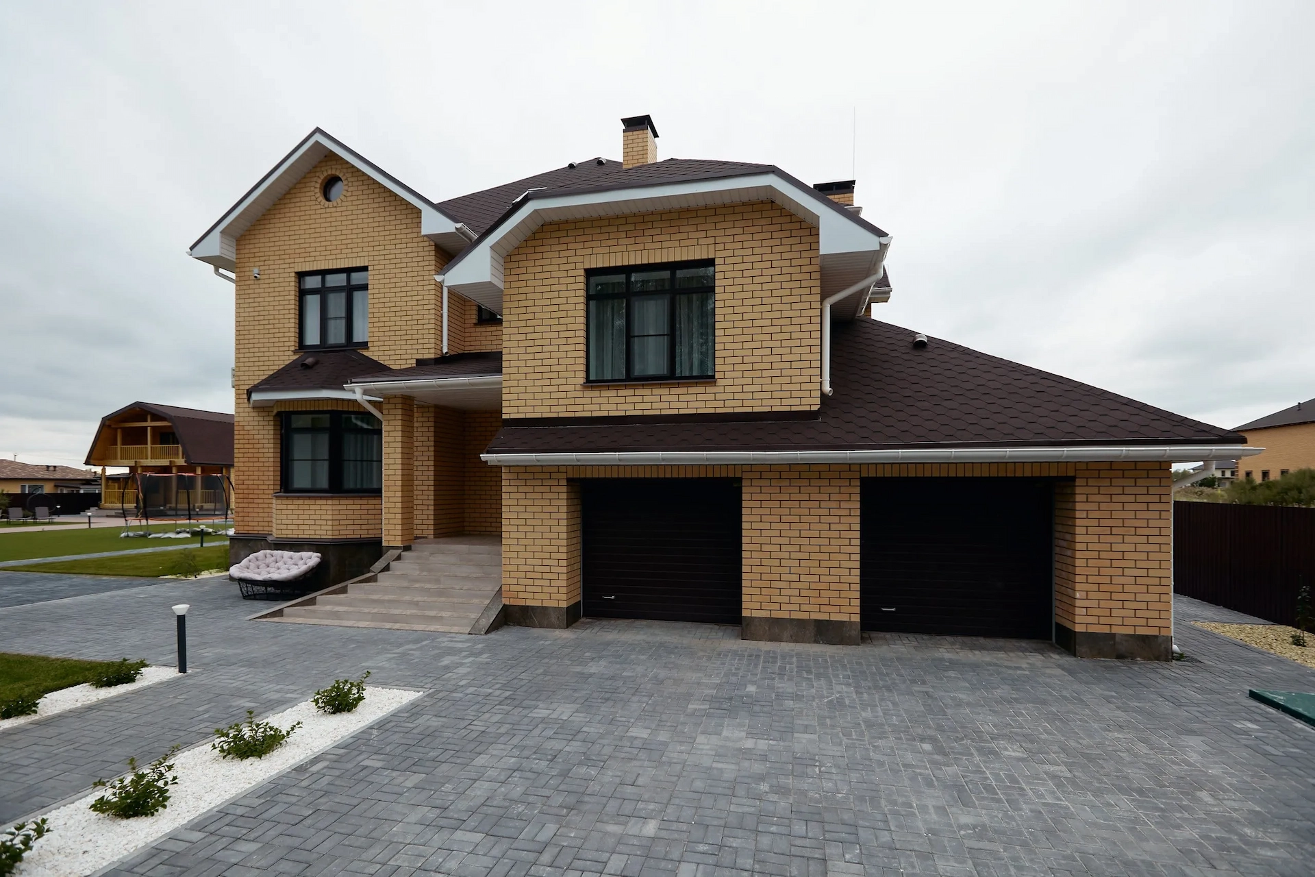 Фасад дома облицован желтым кирпичом и украшен фасадным элементом – эркером. Выделяет этот дом интересная темно-коричневая крыша с белым карнизом, что добавляет дому оригинальности контрастности.