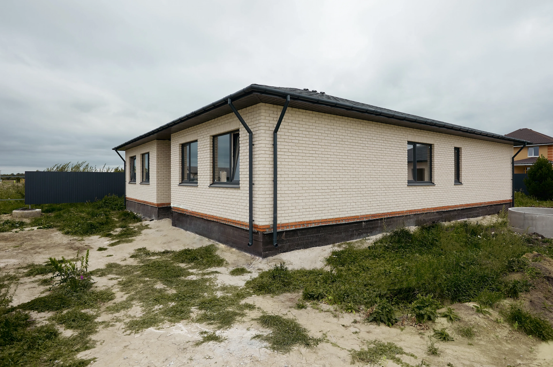 Светлый и приятный внешне дом выполнен в классическом стиле. Благодаря светлому кирпичу фасады выглядят аккуратно и привлекательно, а черные оконные рамы и четырехскатная крыша добавляют современности и элегантности общему виду дома.
