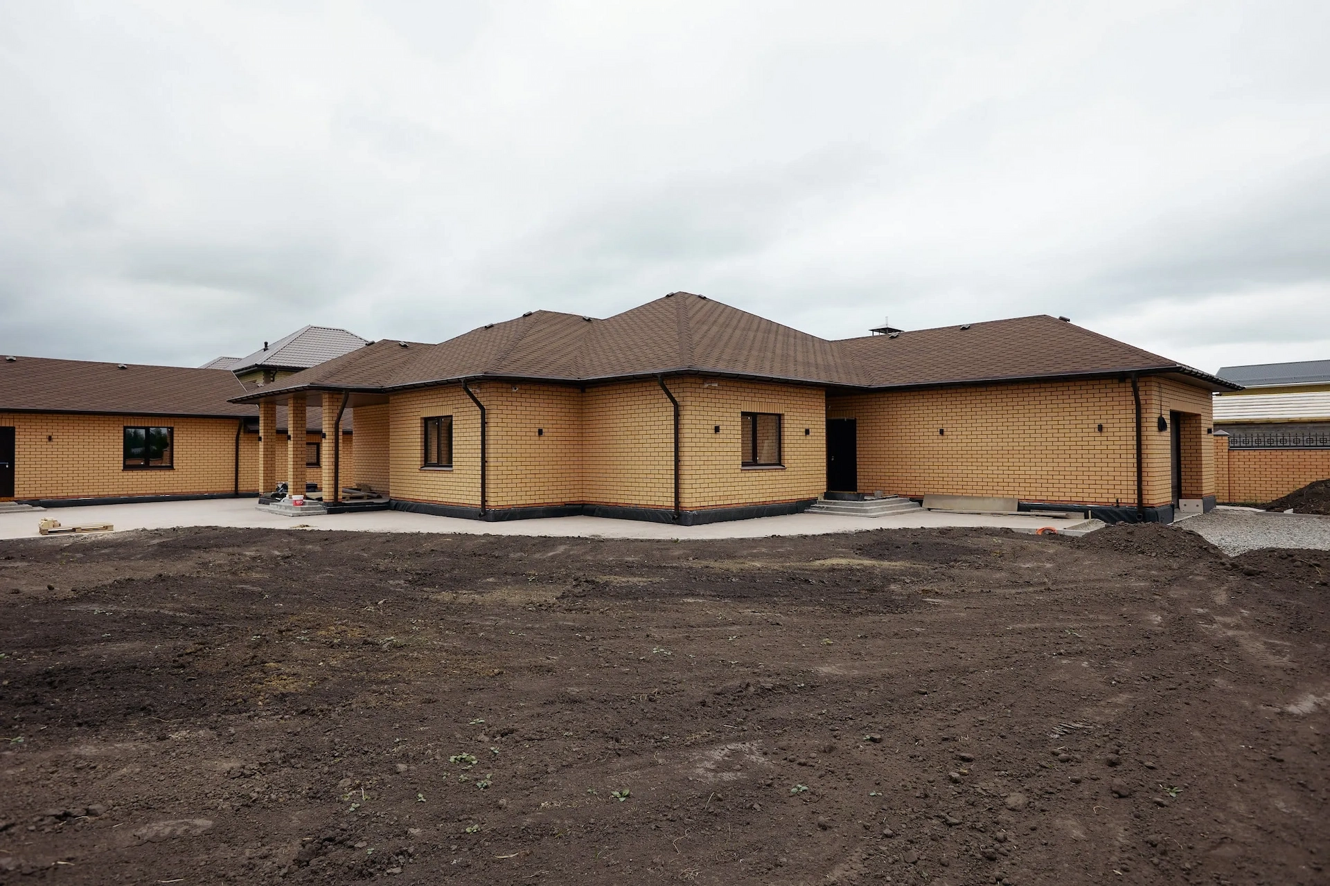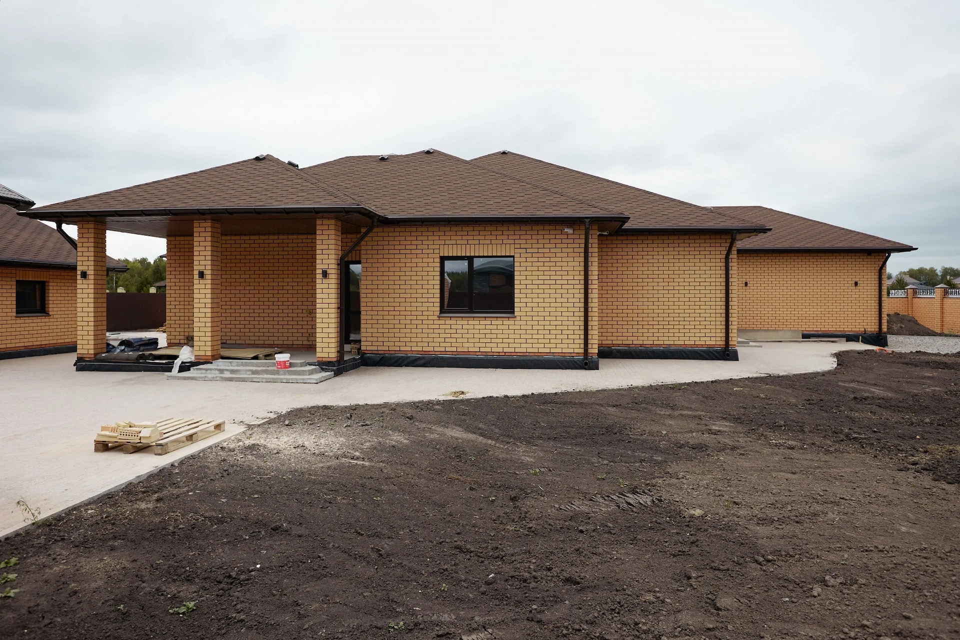 Дом имеет фасады из красивого желтого кирпича, который придает ему теплый и привлекательный внешний вид. Кирпичный фасад также обеспечивает долговечность и надежность строения. В сочетании с контрастным темным цветом крыши и дверей, светлый фасад создает современный классический стиль, а также уютное и ухоженное общее впечатление.