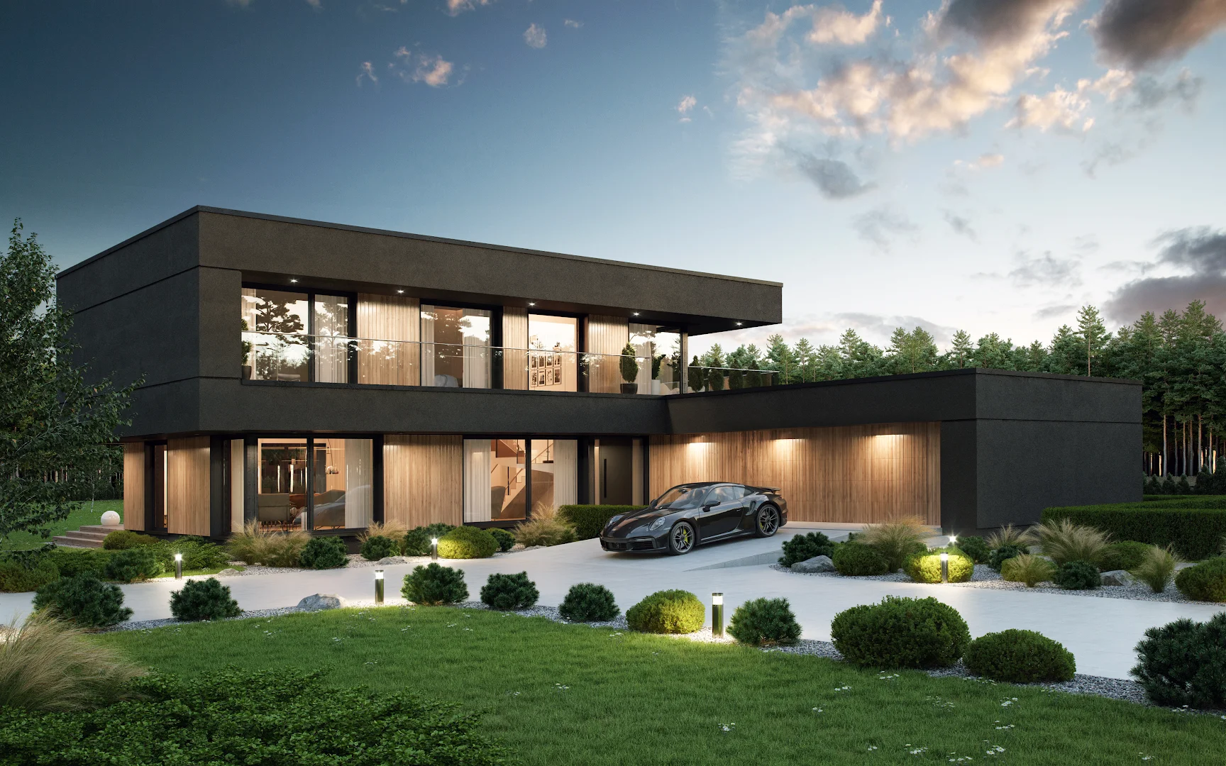 Дом имеет несколько крытых входов, интегрированный гараж, крытую террасу и представляет собой элегантное сочетание комфорта и роскоши.
