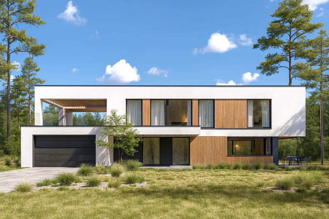 Дом прямоугольной формы, с белой фасадной отделкой. Он оснащён высокими окнами с рамами, которые добавляют зданию элегантности. Центральный вход украшен колоннами, придающими дому особую изысканность.