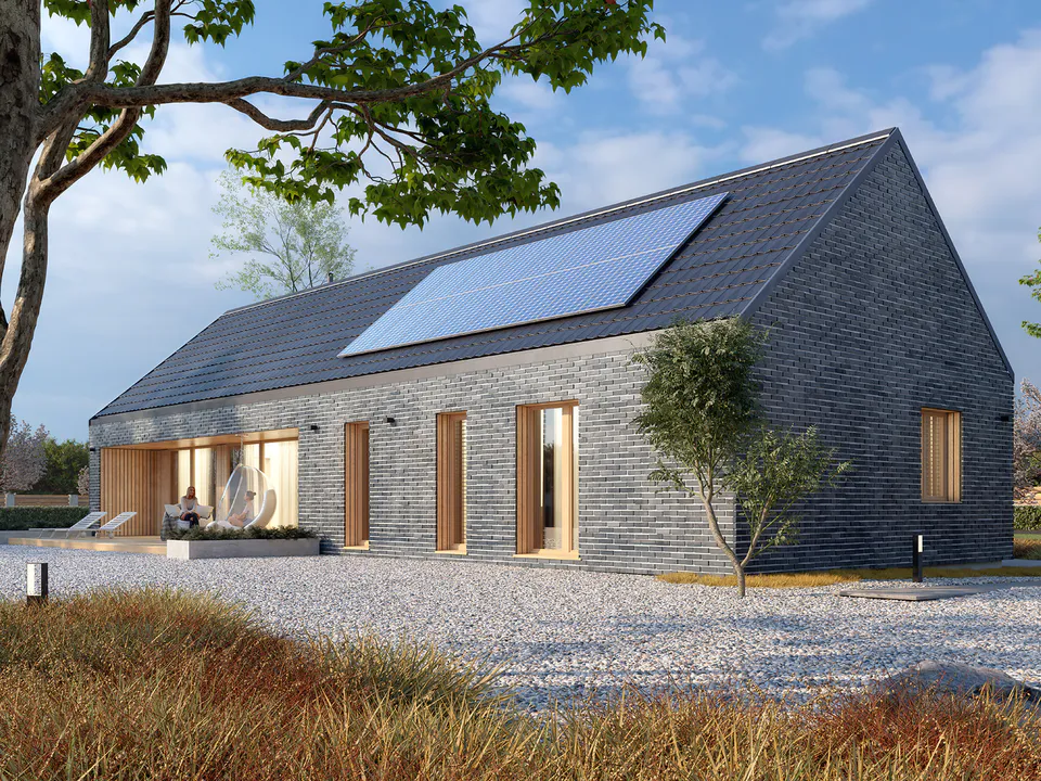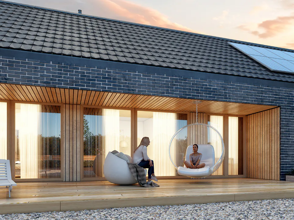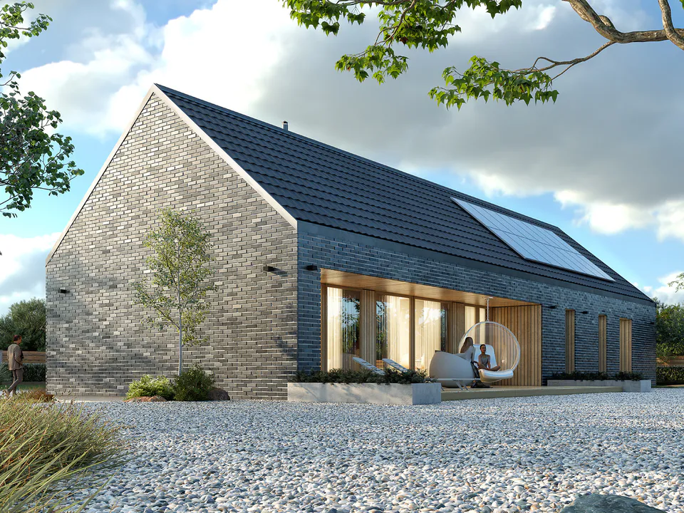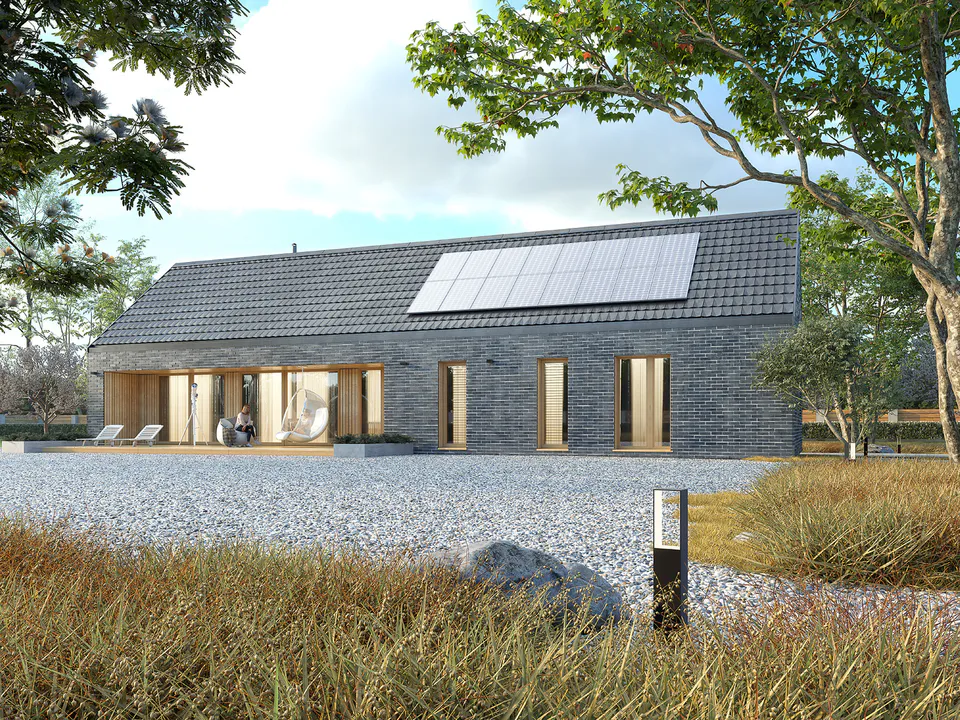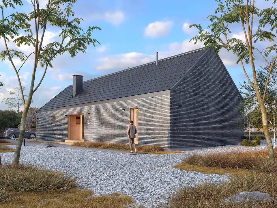 Фасад покрыт фасадным кирпичом и украшен горизонтальными деревянными панелями. Крыша дома покрыта керамической черепицей графитового цвета в цвет фасада.