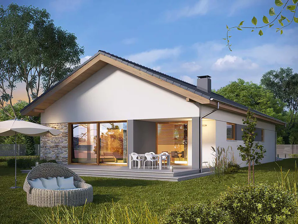 Проект современного одноэтажного дома с террасой и гаражом.