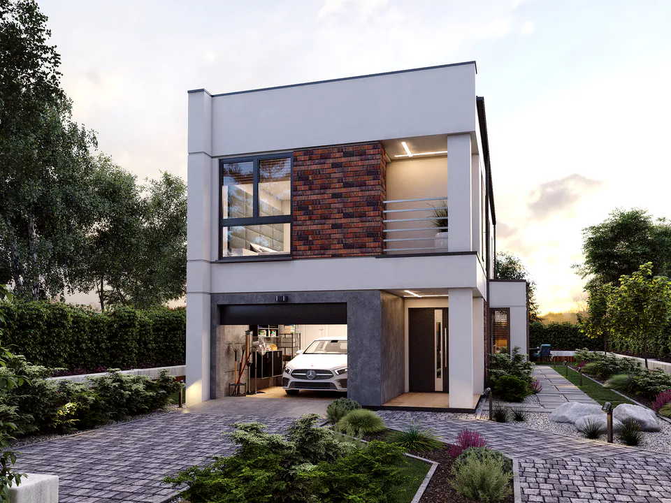 Проект дома с комбинированным фасадом, часть которого выполнена из кирпича, а другая часть окрашена в светлый цвет. Крыша дома двухскатная. Перед домом расположена просторная терраса с деревянным настилом. Над террасой виден каркас, создающий своеобразный козырек и место для отдыха на свежем воздухе.
