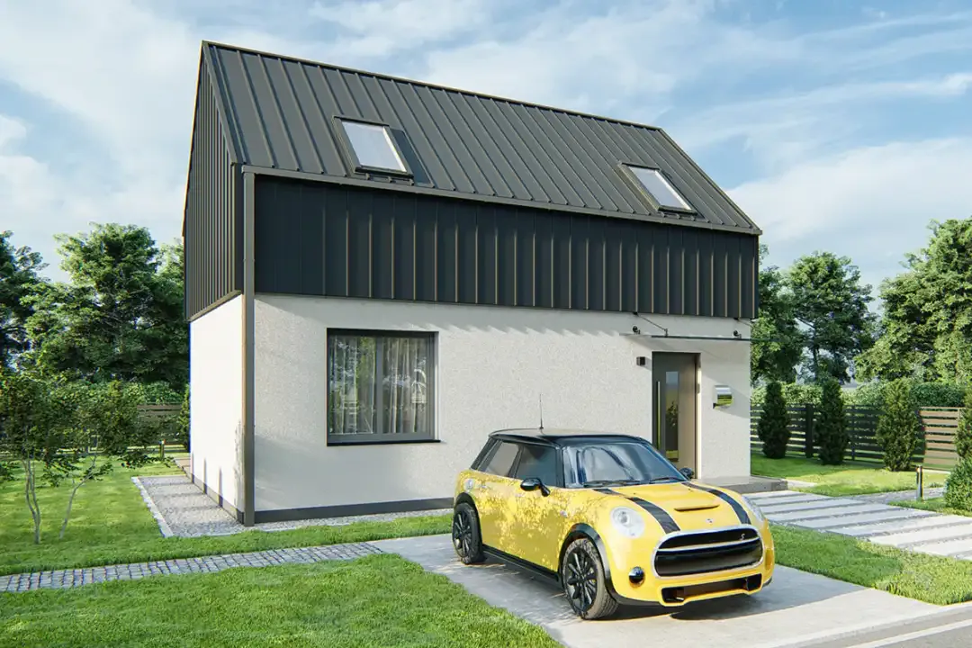 Проект небольшого одноэтажного дома в скандинавском стиле, с террасой крытой перголой.
