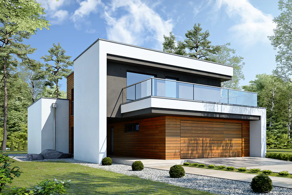 Дом с плоской крышей, четкими линиями и простыми формами, что характерно для Хайтек.