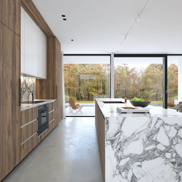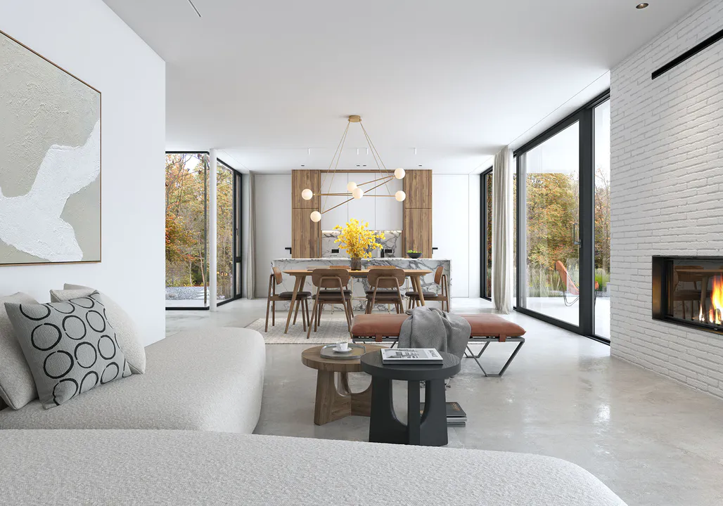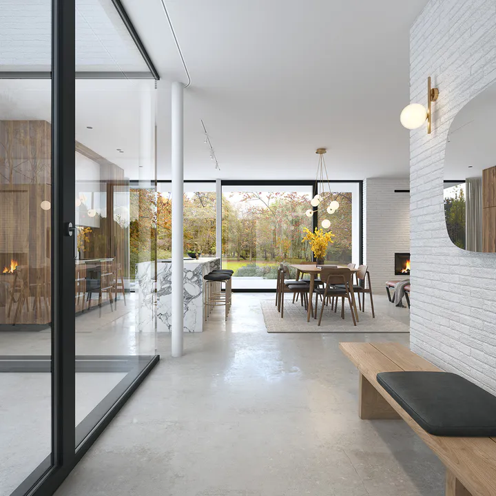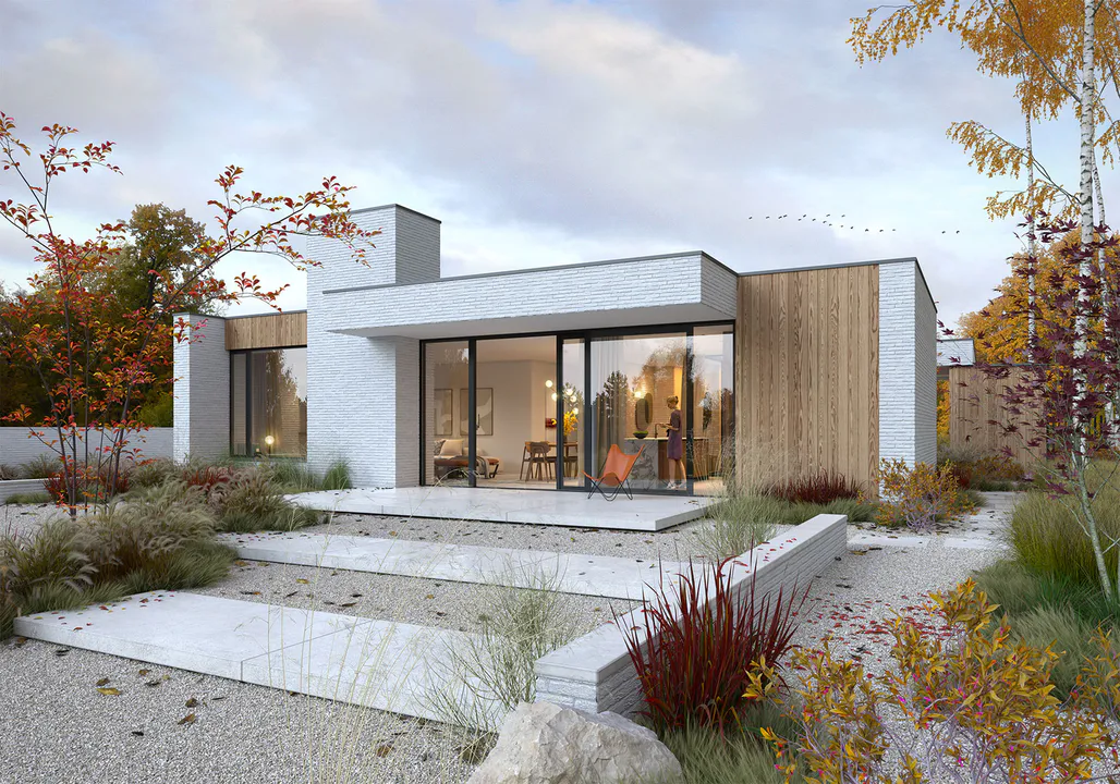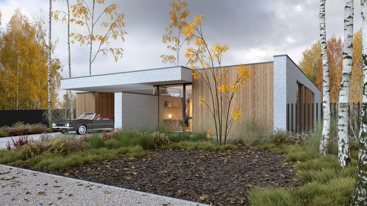 Фасад отделан белой клинкерной плиткой ручной формовки с элементами деревянных панелей, создающих контраст и добавляющих теплоту фасаду.