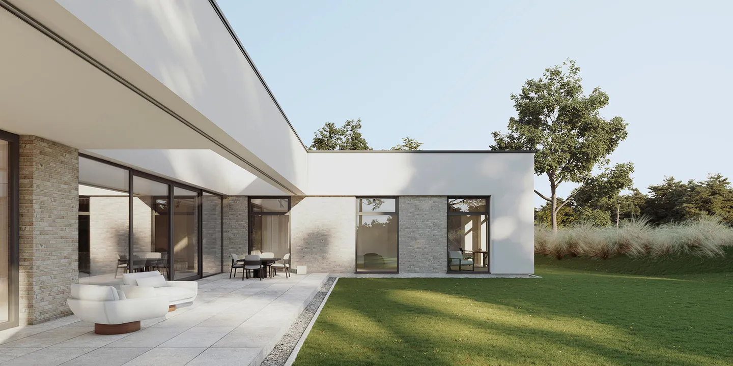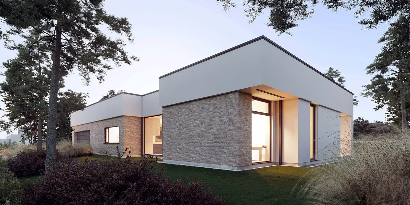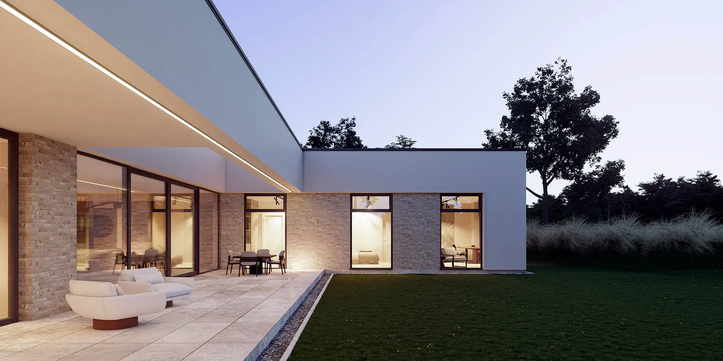 Плоская крыша добавляет современности дому, а большие окна обеспечивают хорошее естественное освещение внутренних помещений.