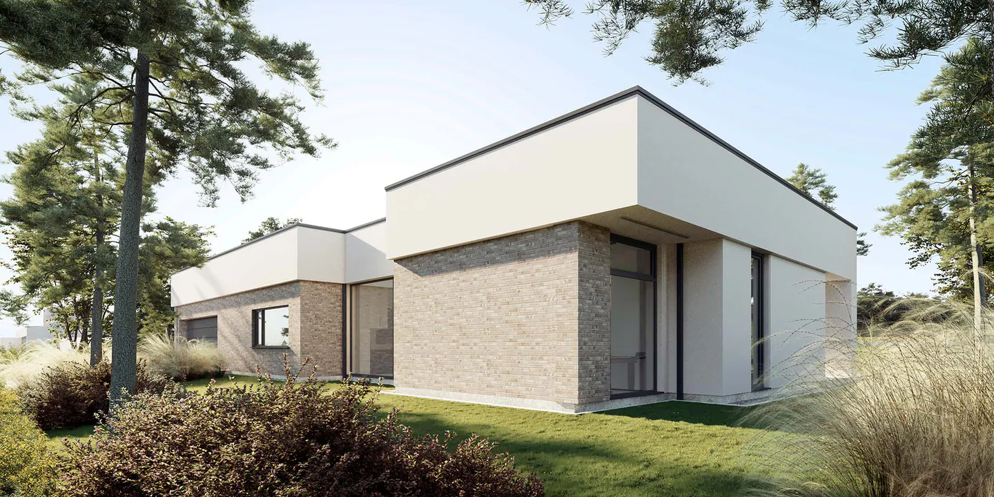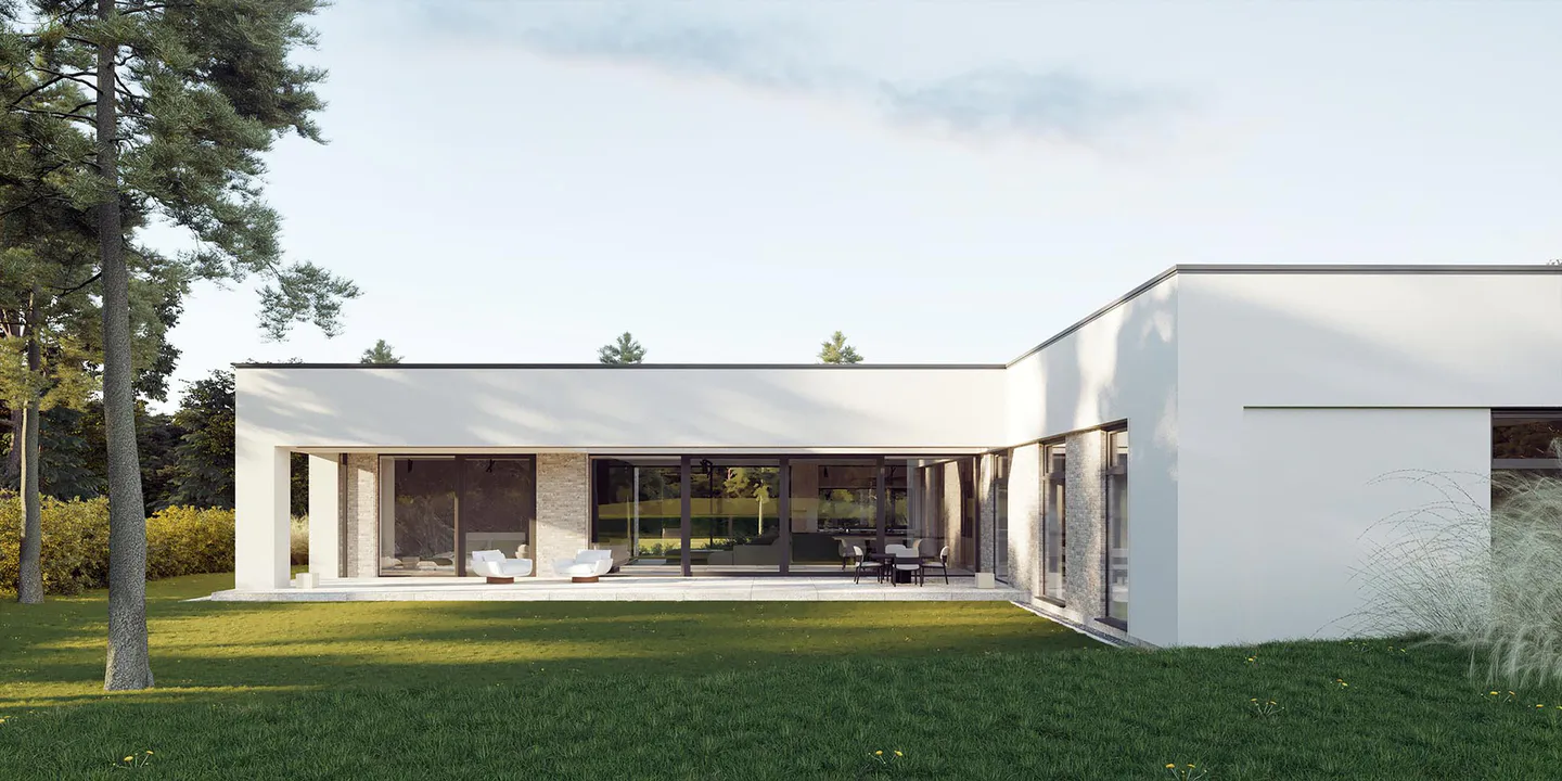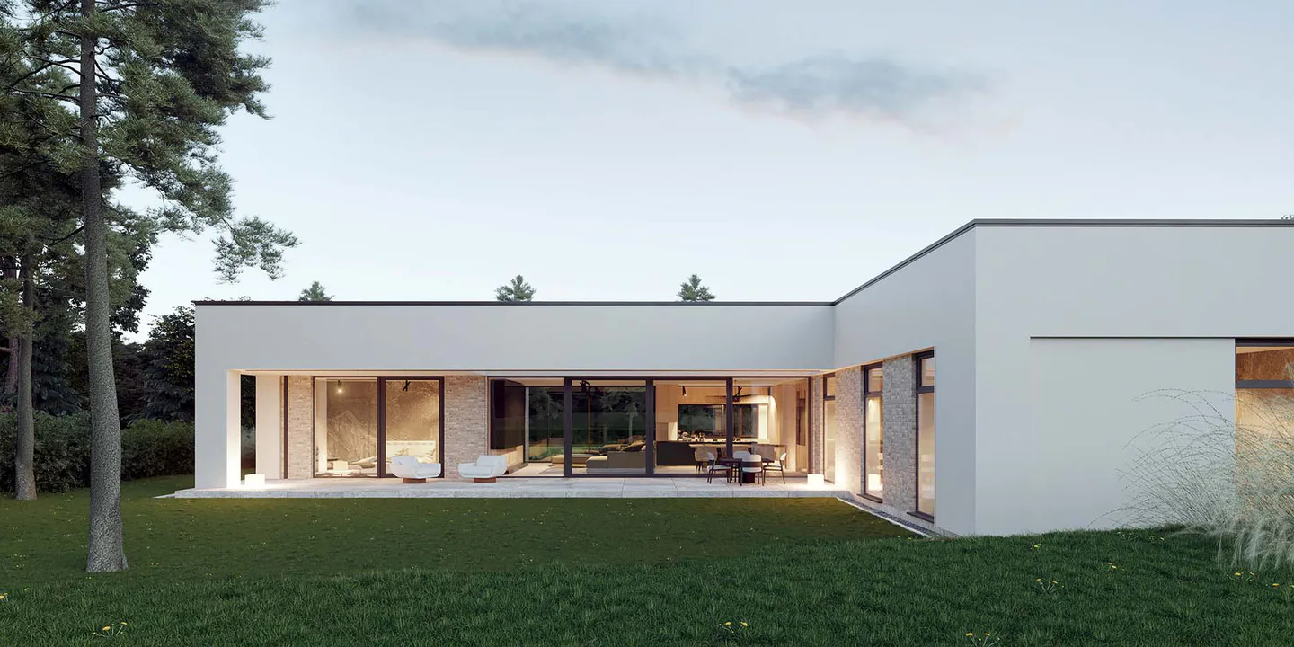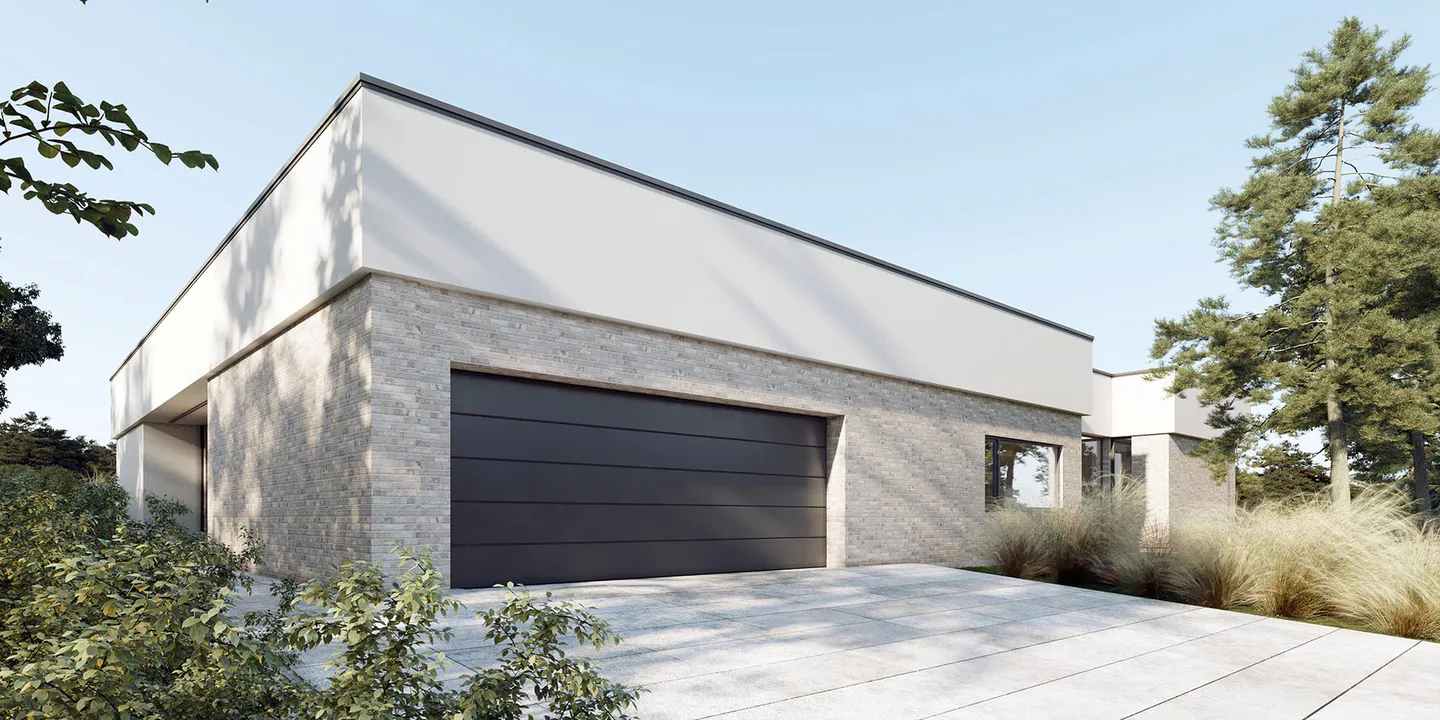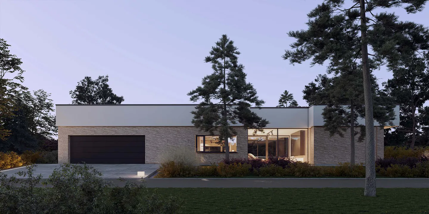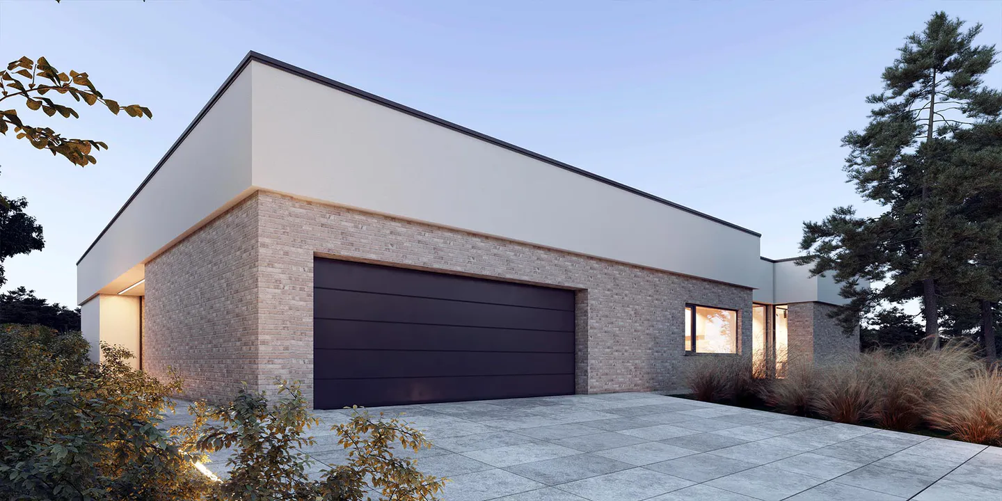 Проект современного одноэтажного дома с гаражом, в минималистичном стиле Хайтек.