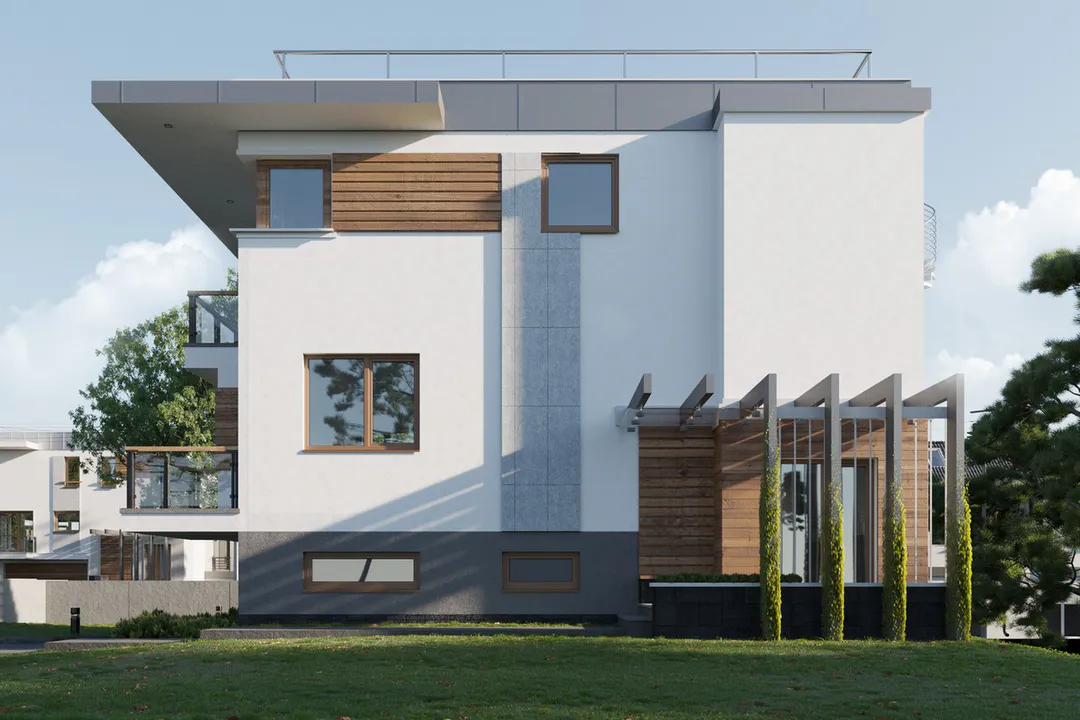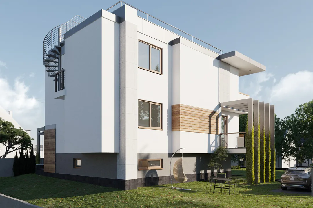 Дом спроектирован в современном стиле Хайтек, характеризующемся чистыми линиями, минималистичным дизайном и использованием контрастных материалов, таких как светлые оштукатуренные поверхности, деревянные элементы и серые акценты из камня.