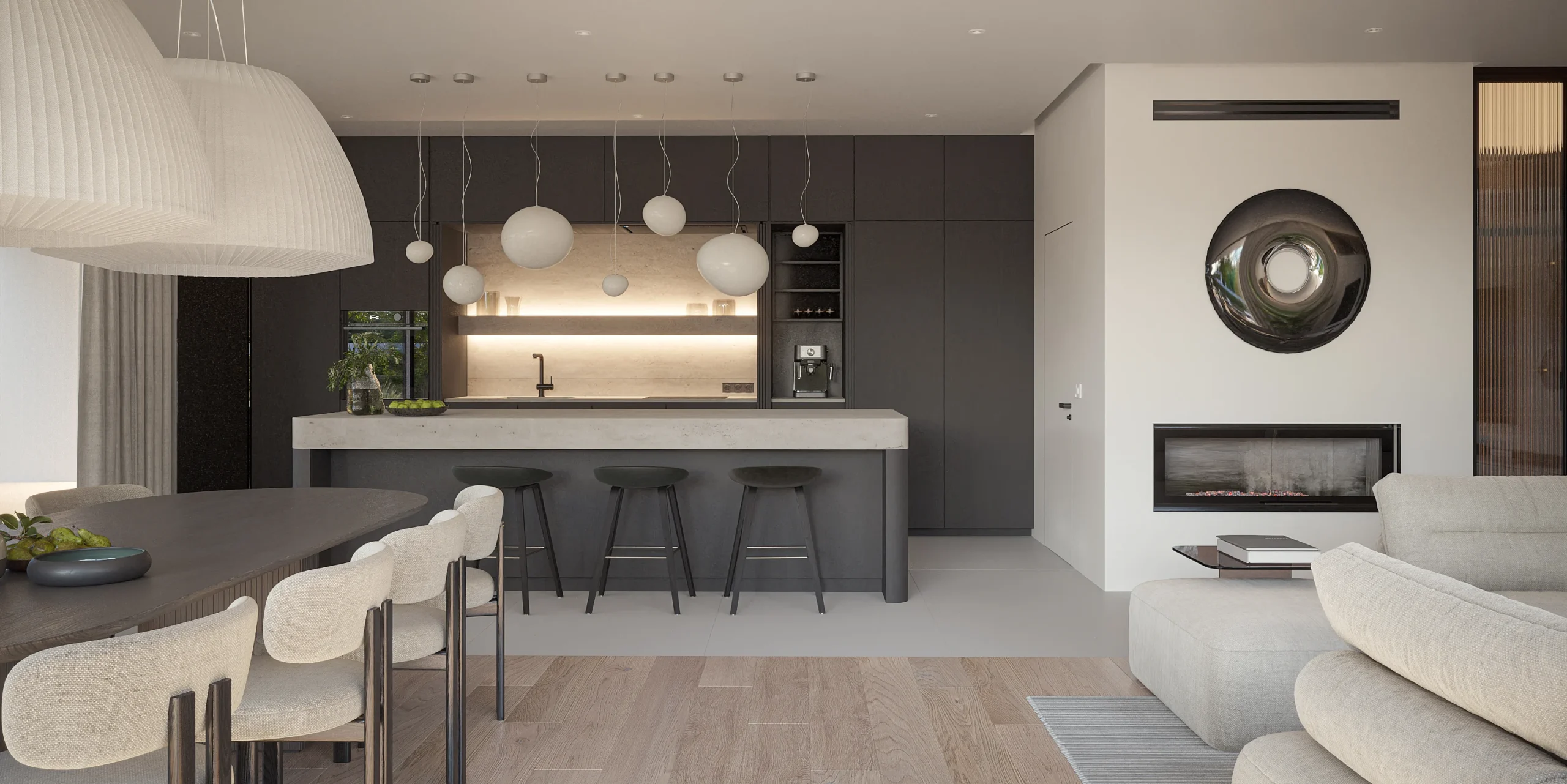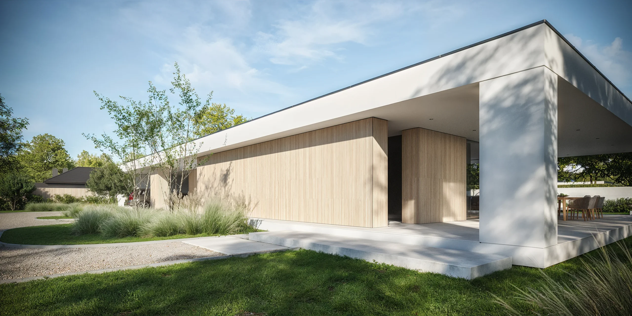 Фасад дома сочетает в себе светлые оштукатуренные поверхности с теплыми деревянными панелями, создавая приятный контраст текстур и оттенков. Большие панорамные окна со стороны террасы позволяют максимально использовать естественное освещение и добавляют современности.