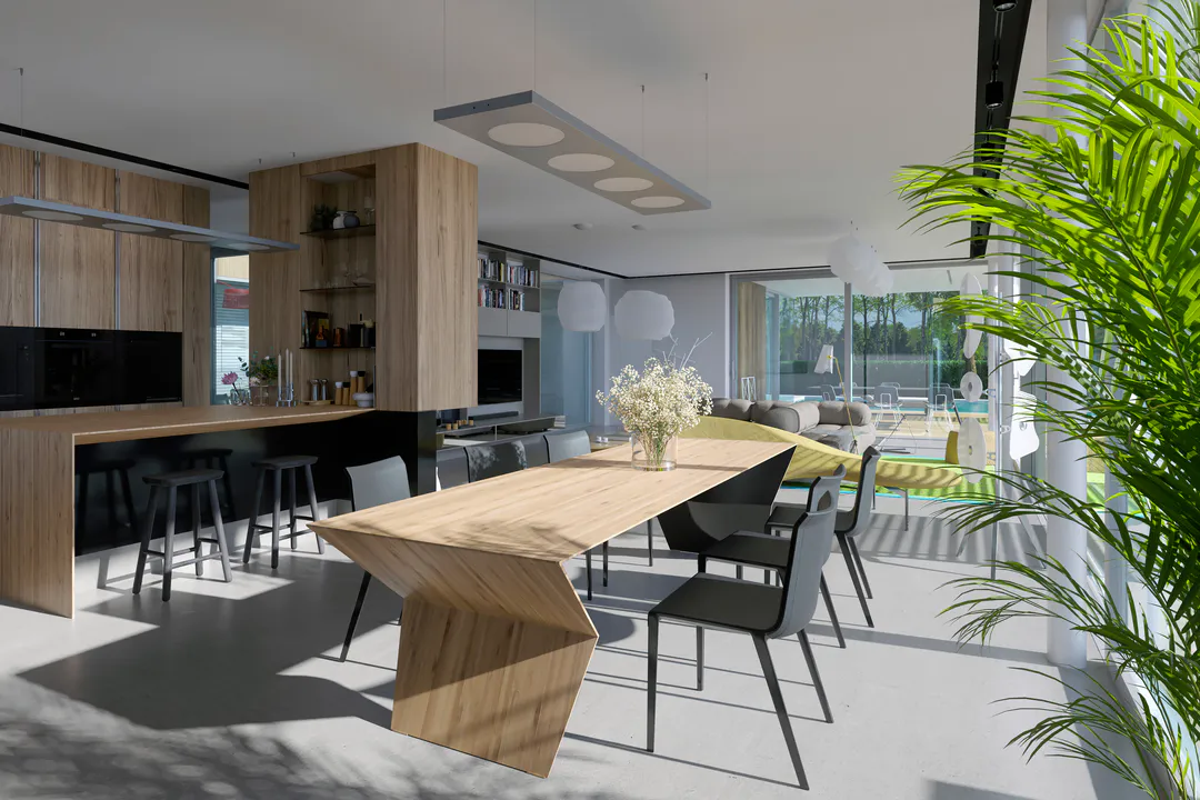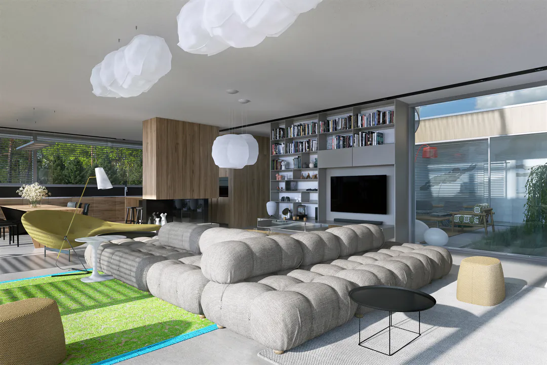 Дом имеет минималистичный дизайн с большими окнами, плоской крышей и преимущественно серой цветовой гаммой.