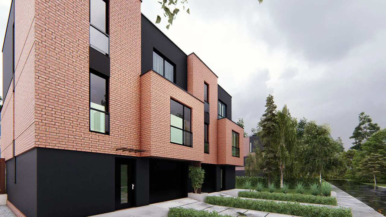 Фасад облицован терракотовым кирпичом, придающим зданию теплоту и текстуру, в то время как темные акценты штукатурки создают четкие линии и подчеркивают геометрию объемов.