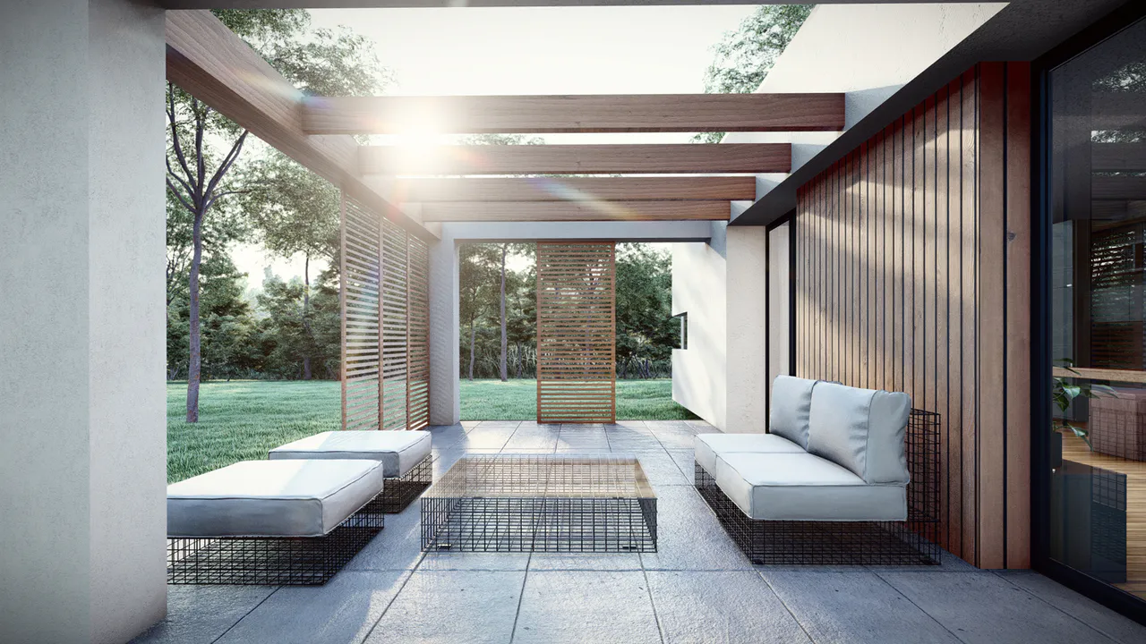 Основная часть фасадов отделана белой штукатуркой, подчеркивающей объемы. Часть фасада облицована деревянными панелями, что придает теплоту и создает контраст с белыми оштукатуренными стенами.