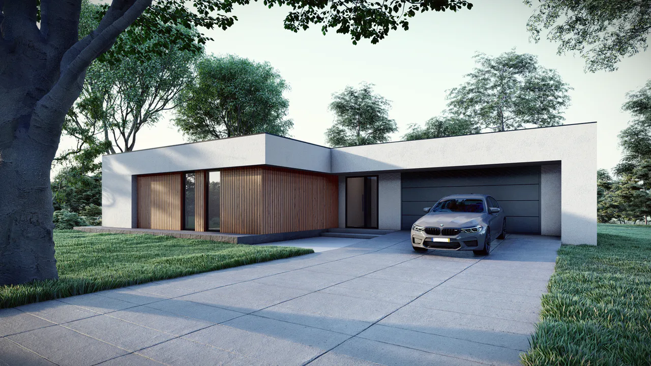 Проект одноэтажного дома с плоской крышей, гаражом и террасой.