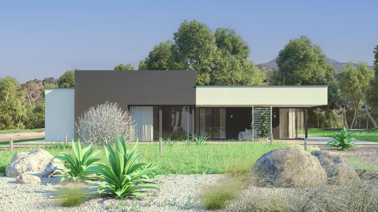 Проект современного одноэтажного дома с плоской крышей, террасой и гаражом.