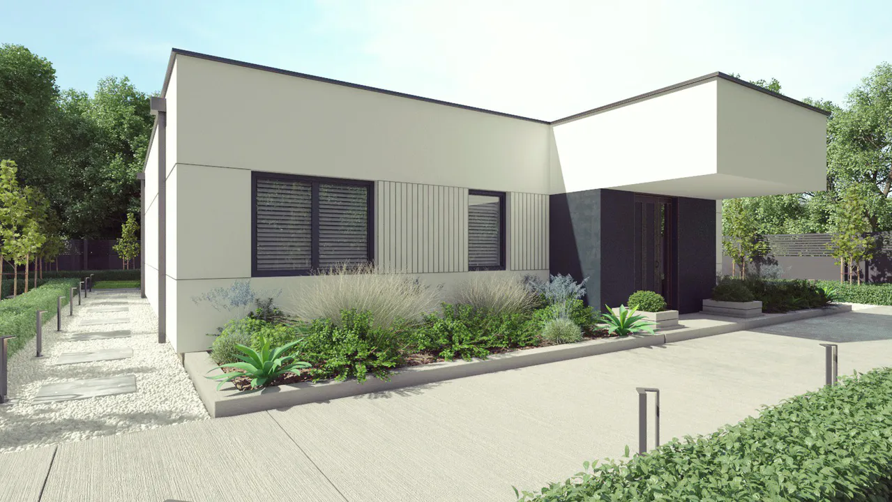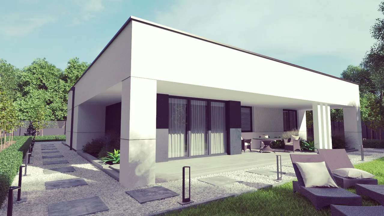 Проект одноэтажного дома в современном стиле с плоской крышей.