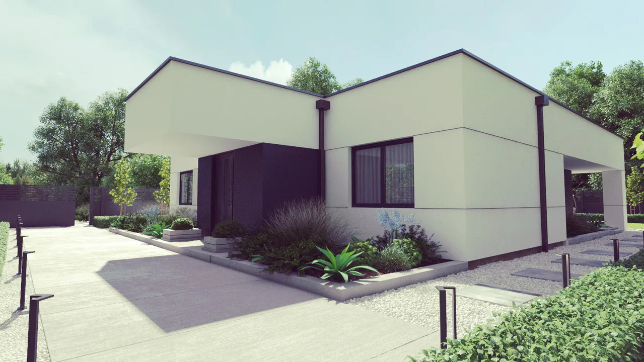 Дом представляет собой современное архитектурное решение, отличающееся минималистичным дизайном и четкими линиями. Отсутствие лишних декоративных элементов подчеркивает функциональность и чистоту форм.