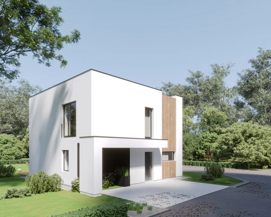 Основная часть фасада выполнена в белом цвете. Для контраста и акцентов используются вертикальные вставки из дерева и темных композитных панелей, что создает современный и стильный внешний вид.