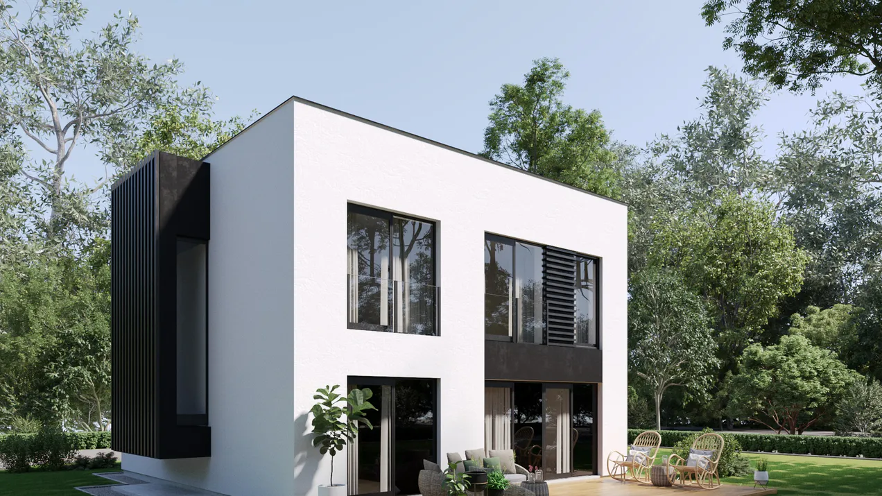 Проект двухэтажного дома с плоской крышей, гаражом и террасой.