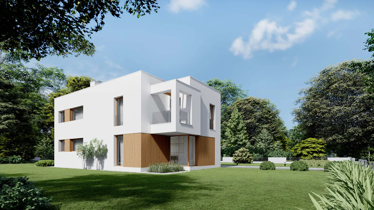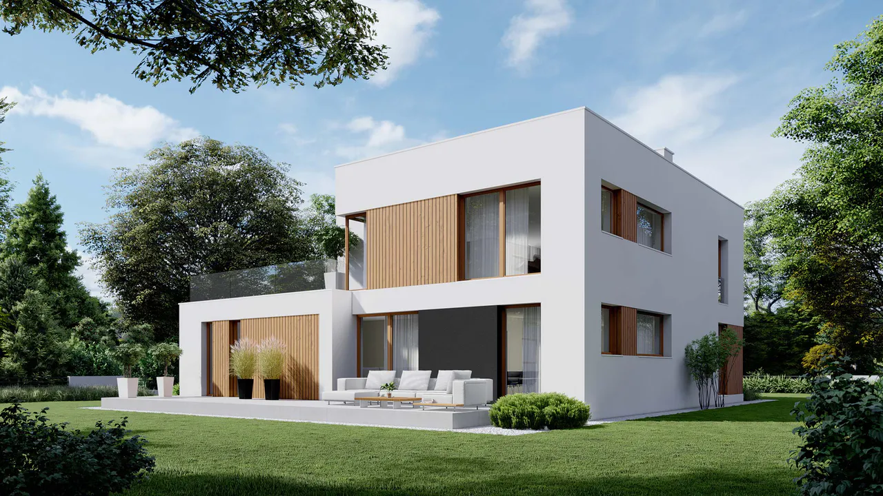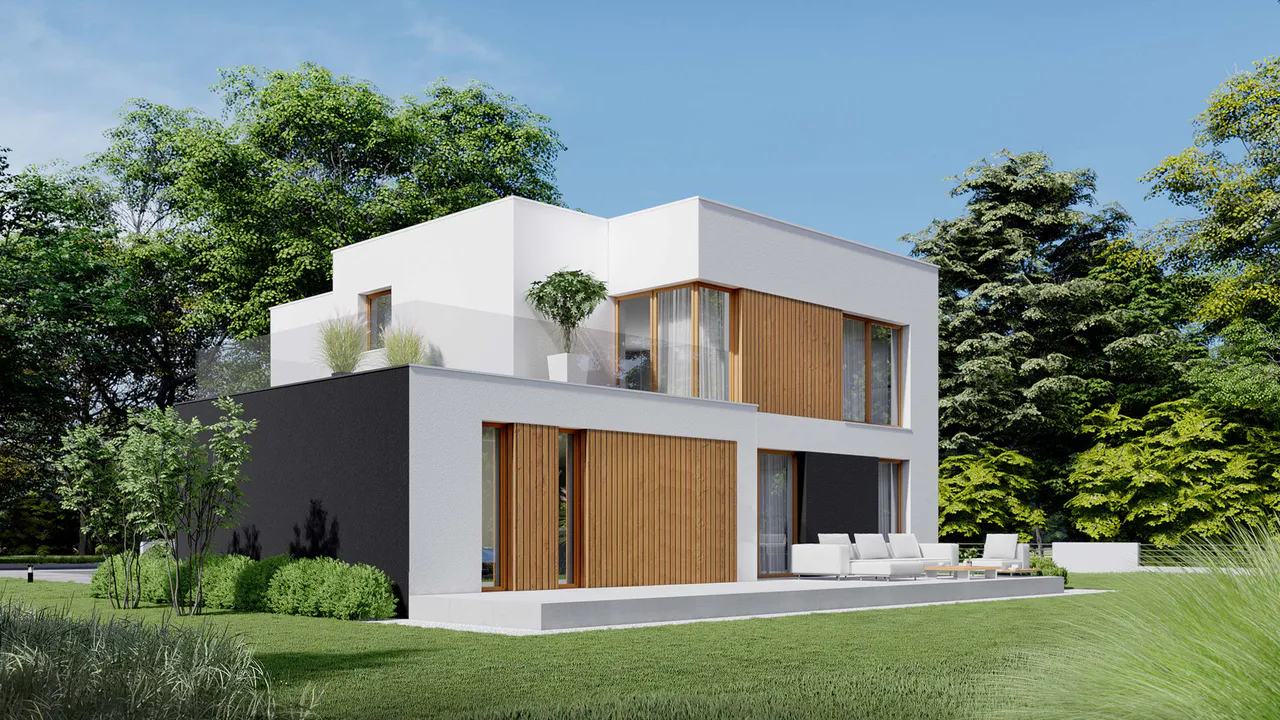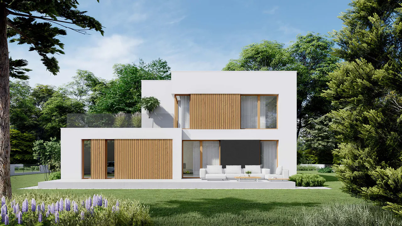 Дом с современным дизайном с плоской крышей и большими окнами. Архитектура дома предполагает наличие балкона на втором этаже и террасу.