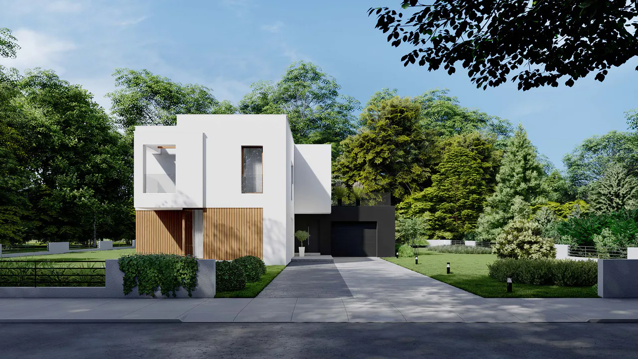 На фасаде дома использованы контрастные цвета штукатурки: белый и черный, а также элементы из дерева.