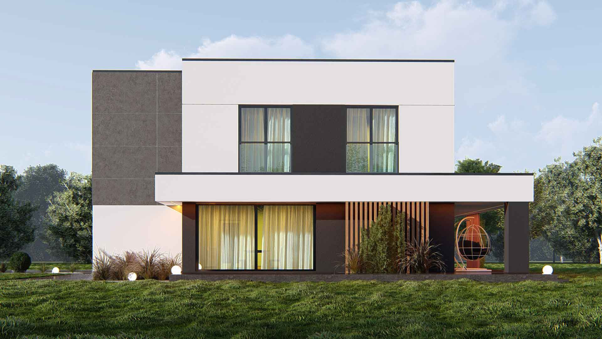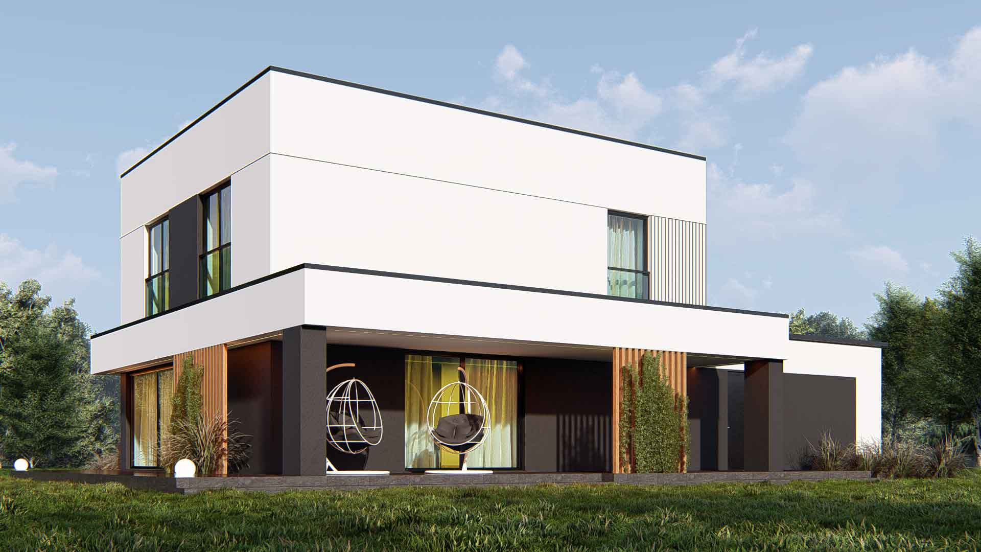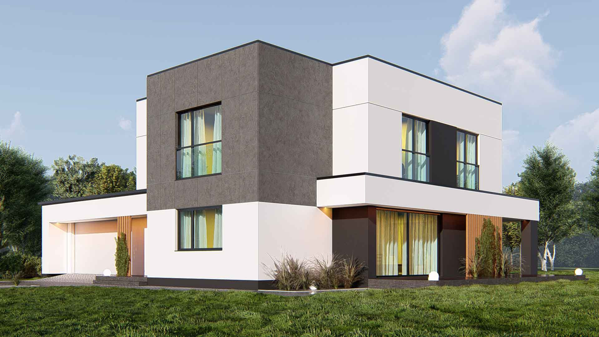Проект представляет собой современный двухэтажный дом в минималистическом стиле Хайтек. Характерные черты дома включают плоскую крышу, большие окна и чистые линии.