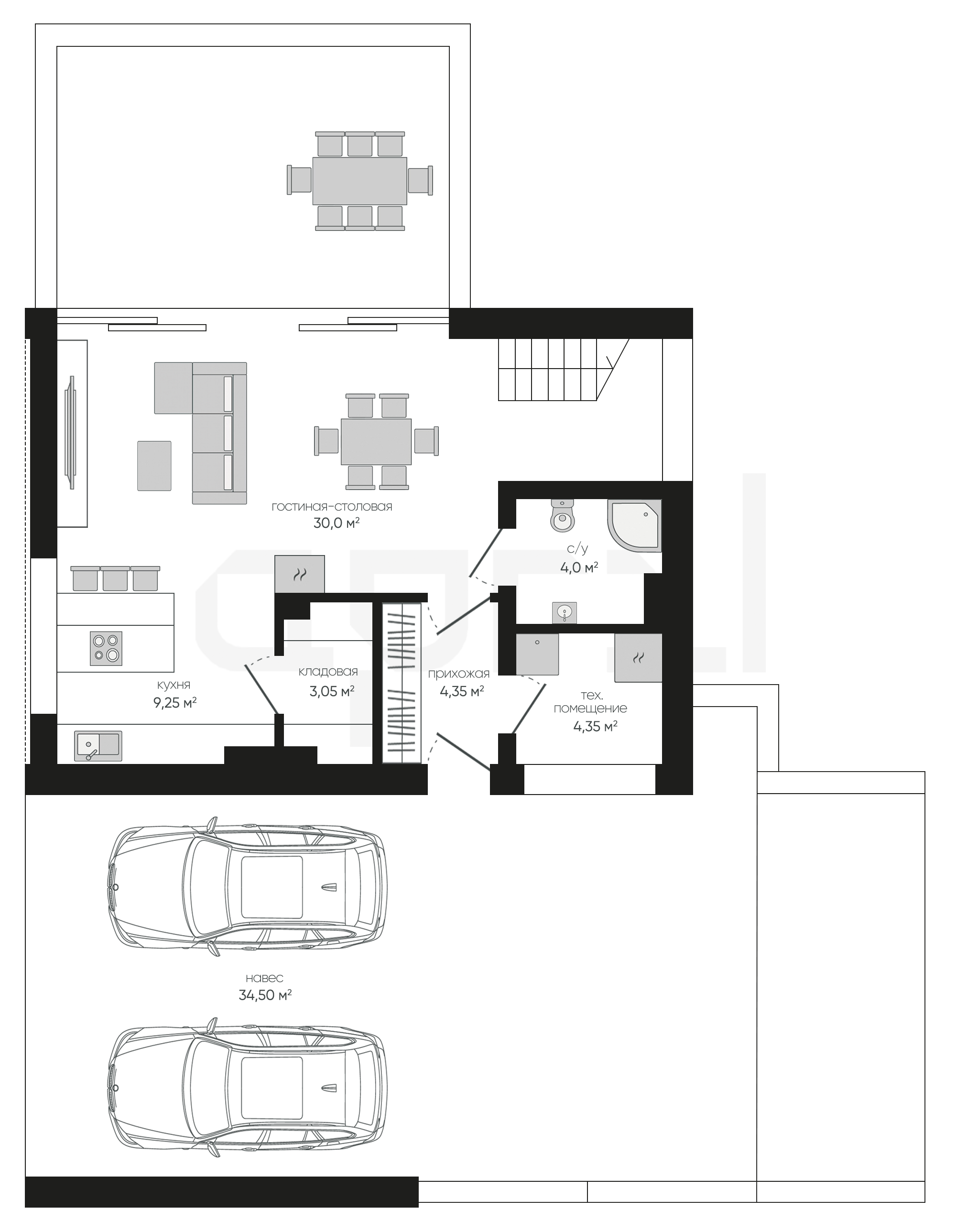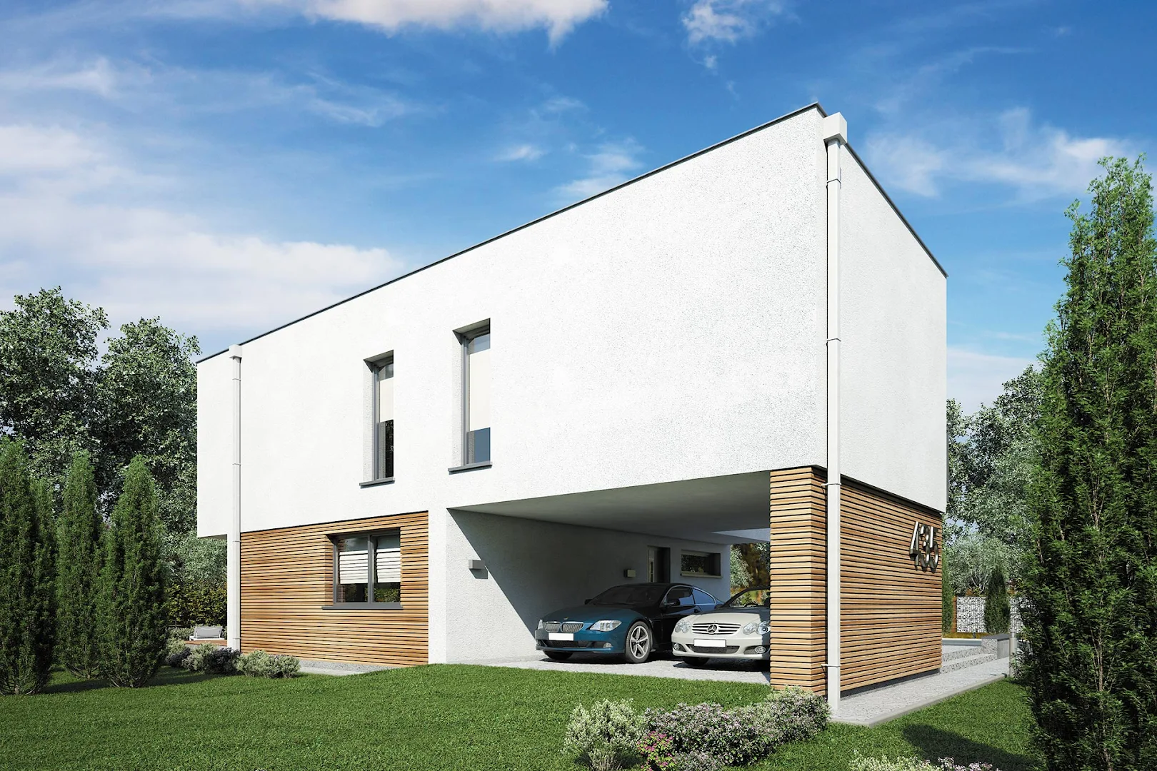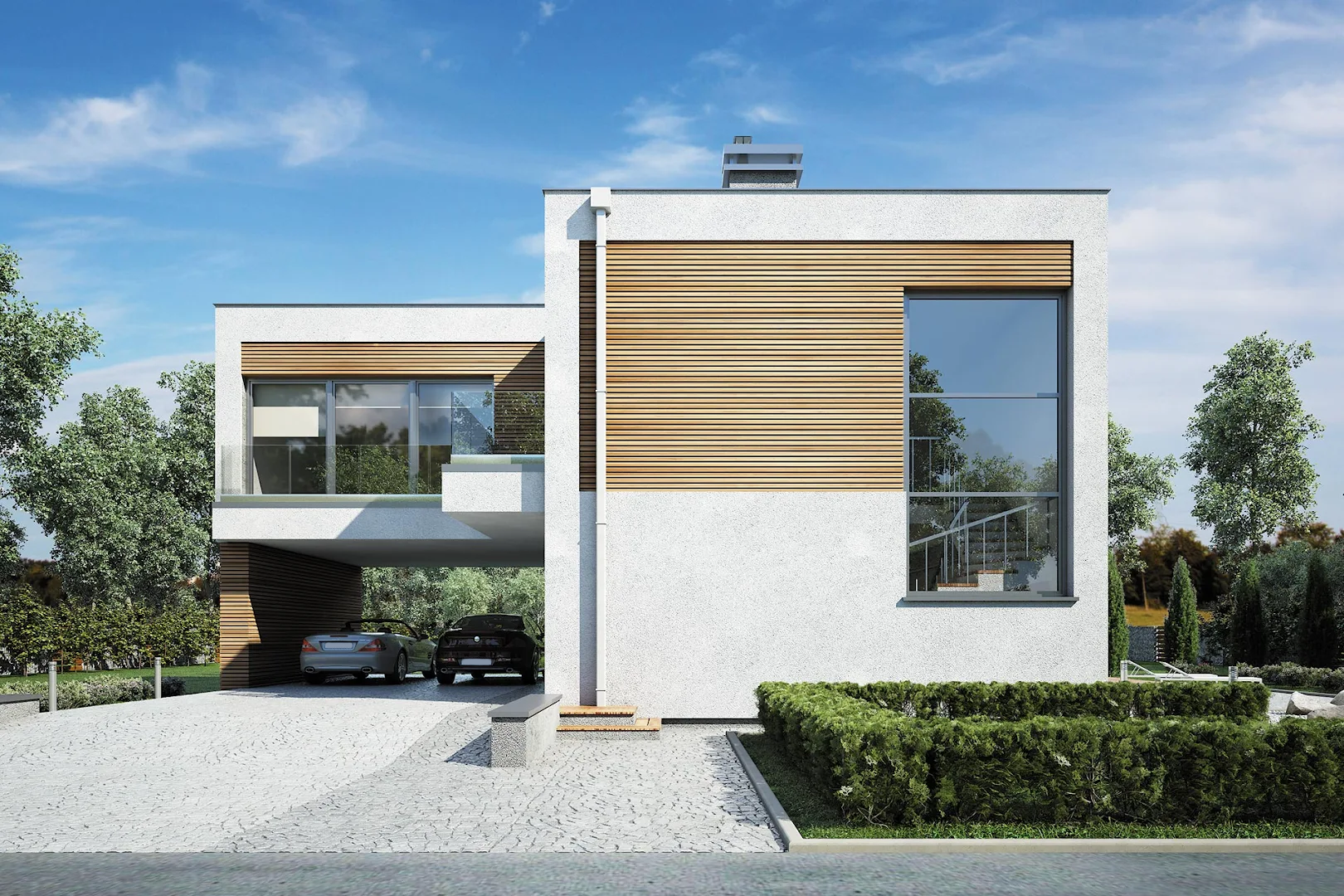 Интегрированный в конструкцию дома навес обеспечивает парковочное место для двух машин, являясь при этом частью архитектурного решения.
