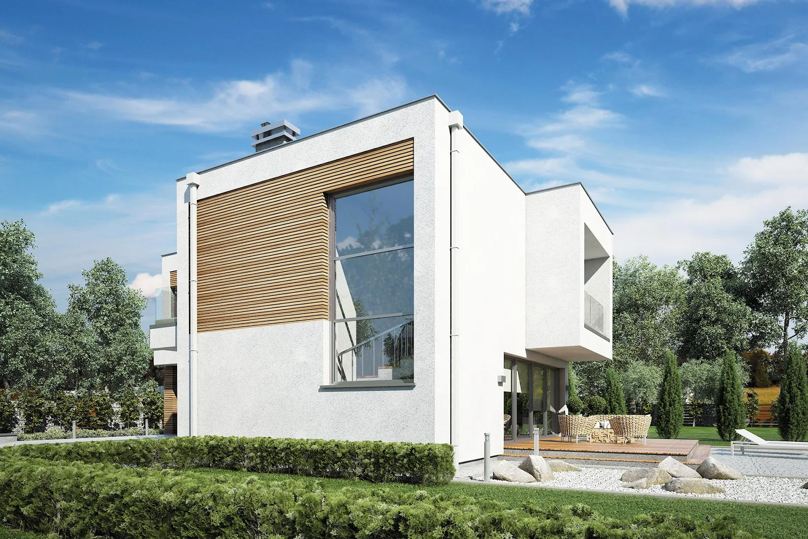 Фасад комбинирует отделку, включающую белую штукатурку и элементы деревянной облицовки.