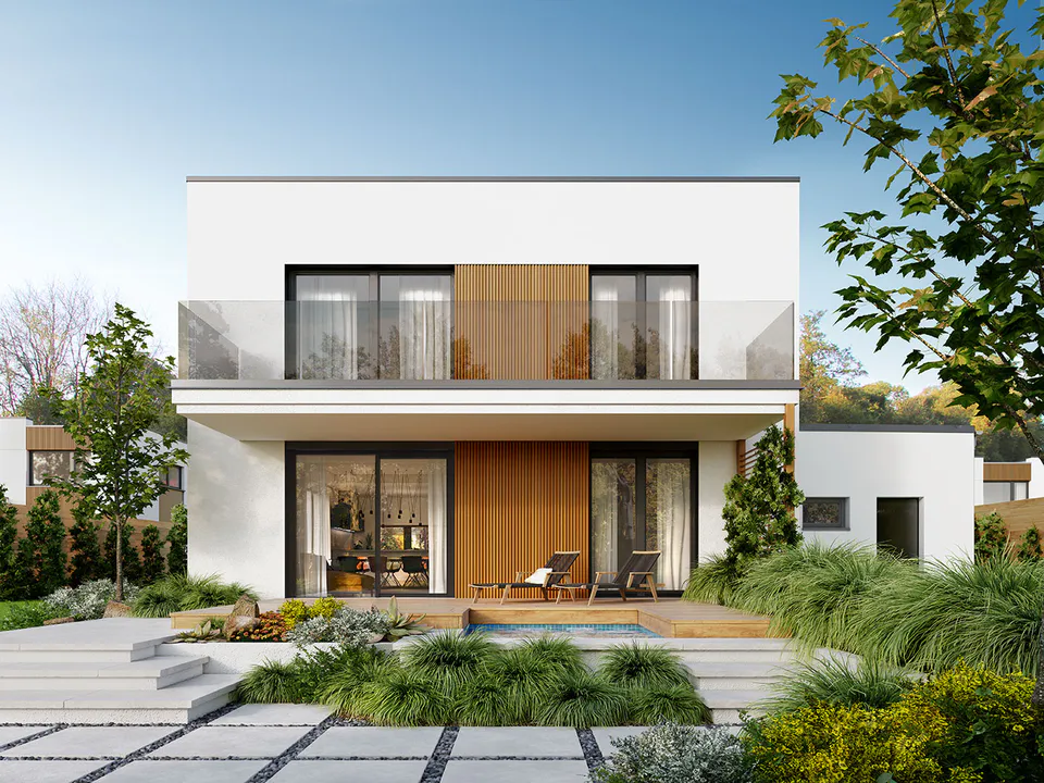 Дом отличается минималистичным дизайном с чистыми линиями, плоской крышей и большими окнами. Архитектура подчеркивает функциональность и простоту, характерные для современного стиля Хайтек.