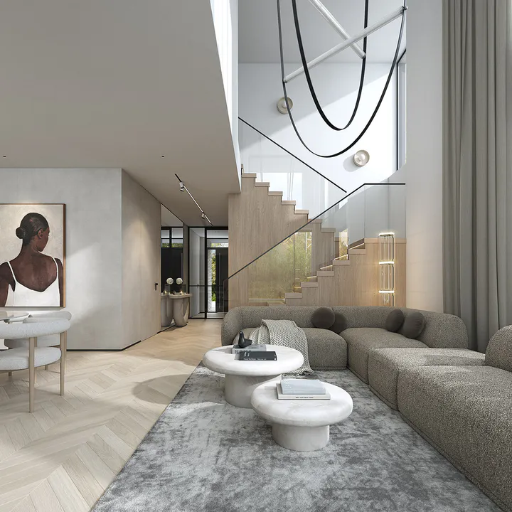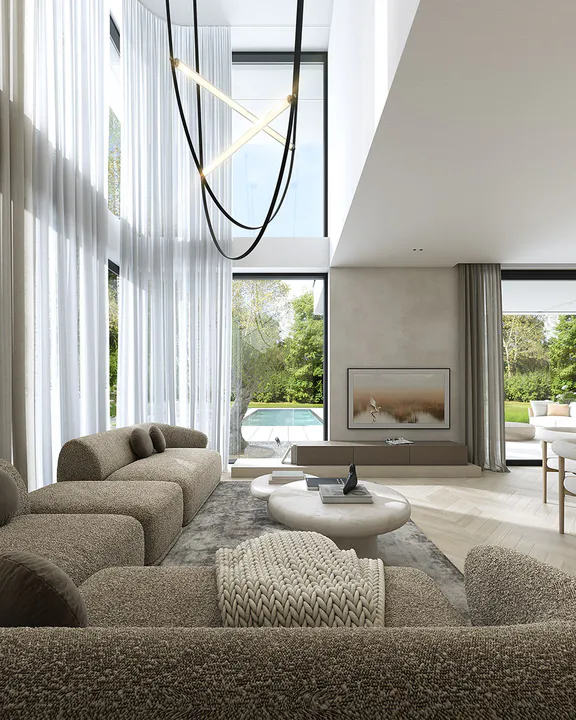 Дизайн дома характеризуется чистыми линиями, большими панорамными окнами и минималистичным дизайном.