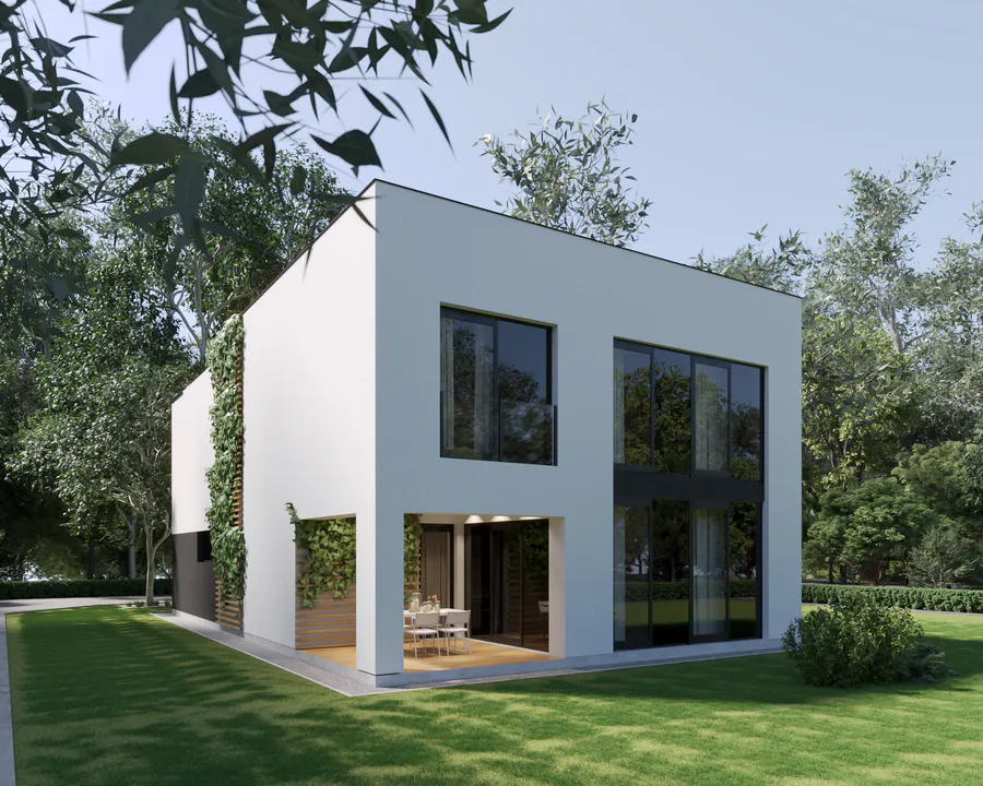 Дом имеет чистые линии, плоскую крышу и минималистичный дизайн.