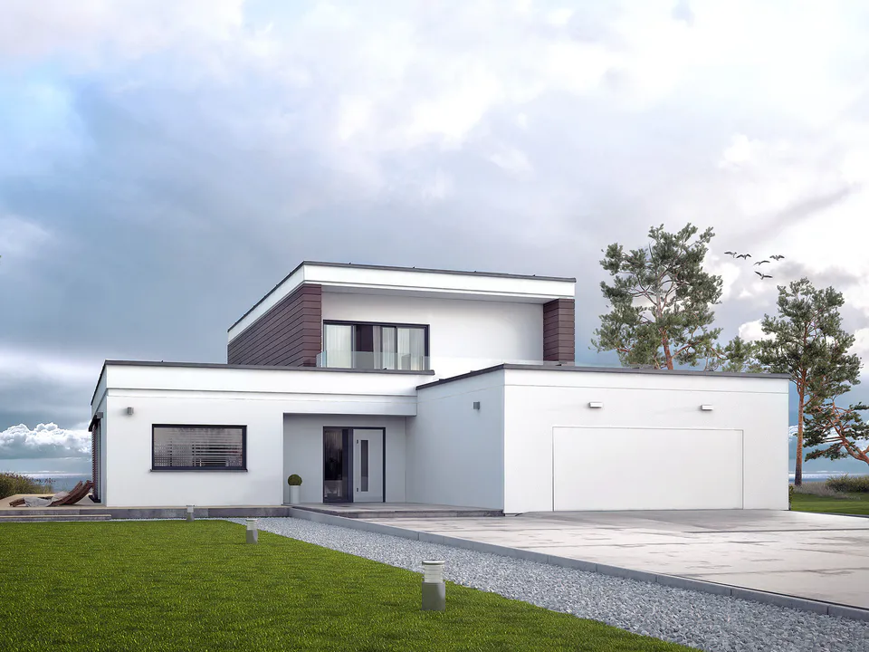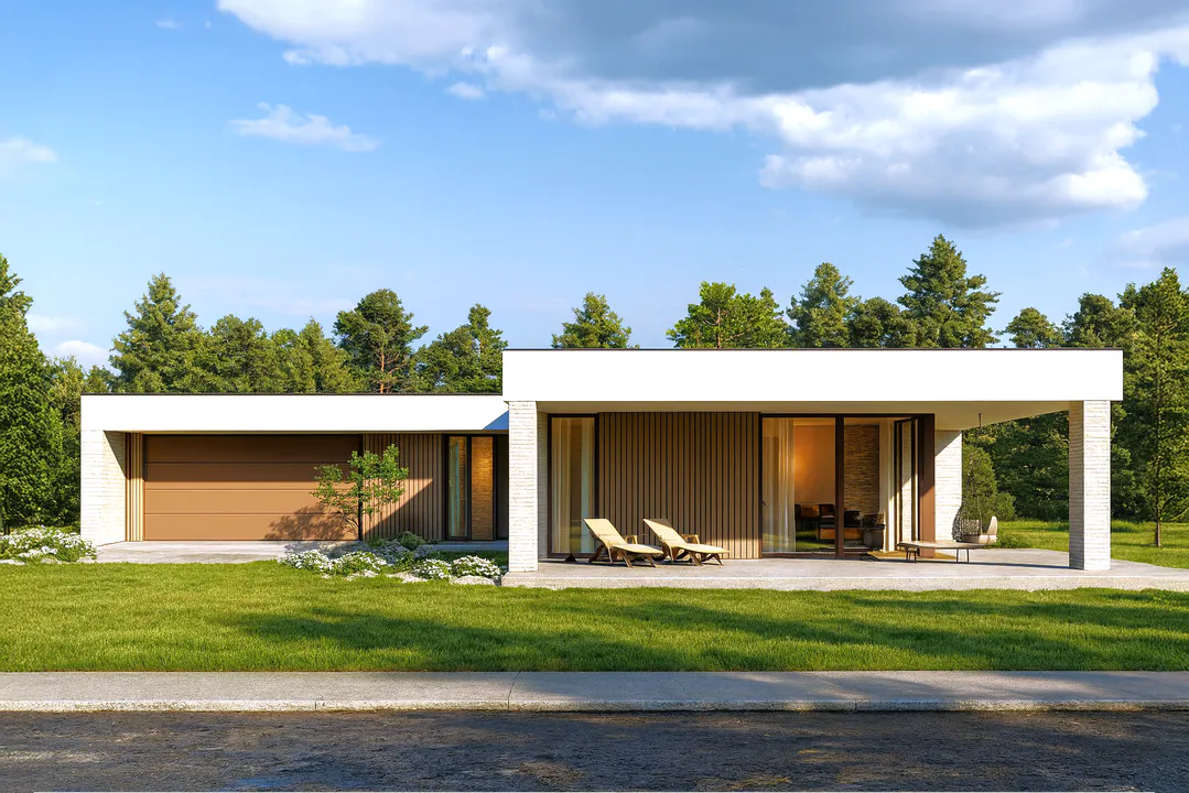 Проект современного одноэтажного дома с плоской крышей, гаражом и террасой.