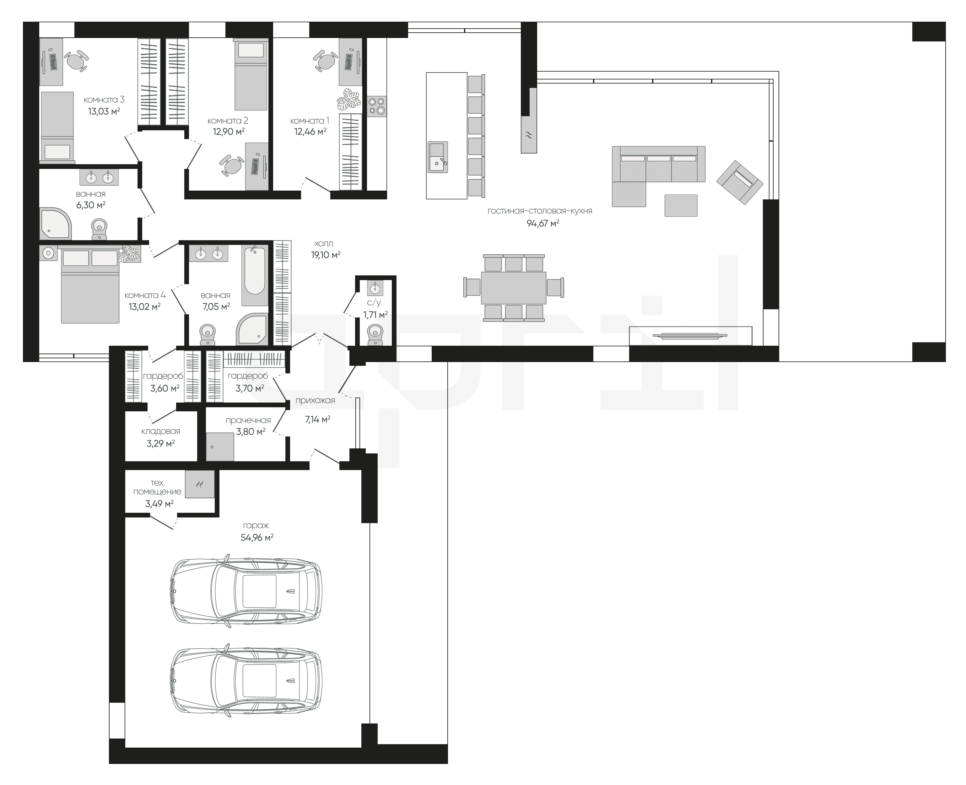 Проект является современным решением для семьи, которая ценит лаконичный дизайн, логику в пространстве и стремится к комфорту одноэтажного проживания.
